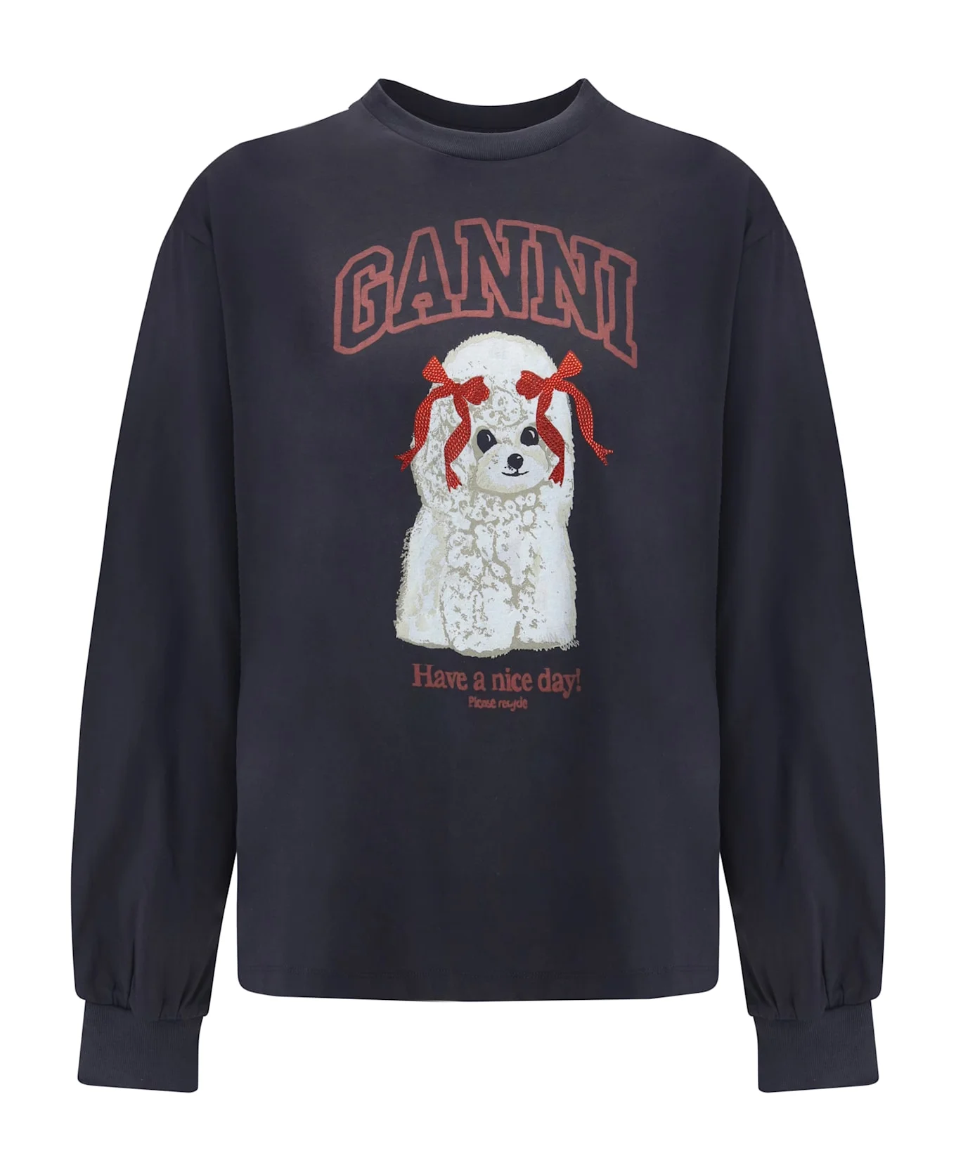 The poodle longsleeve by ganni brings a charming, playful twist to an everyday essential. the round neckline and long sleeves create a clean, relaxed silhouette, while ribbed edges add subtle structure. the poodle print graphic infuses the piece with whimsical personality, complemented by the signature ganni logo. a soft, expressive long-sleeve that blends comfort with unmistakable character. Composition: 100% % Cotton Made in: Portugal Model number: A1050036252