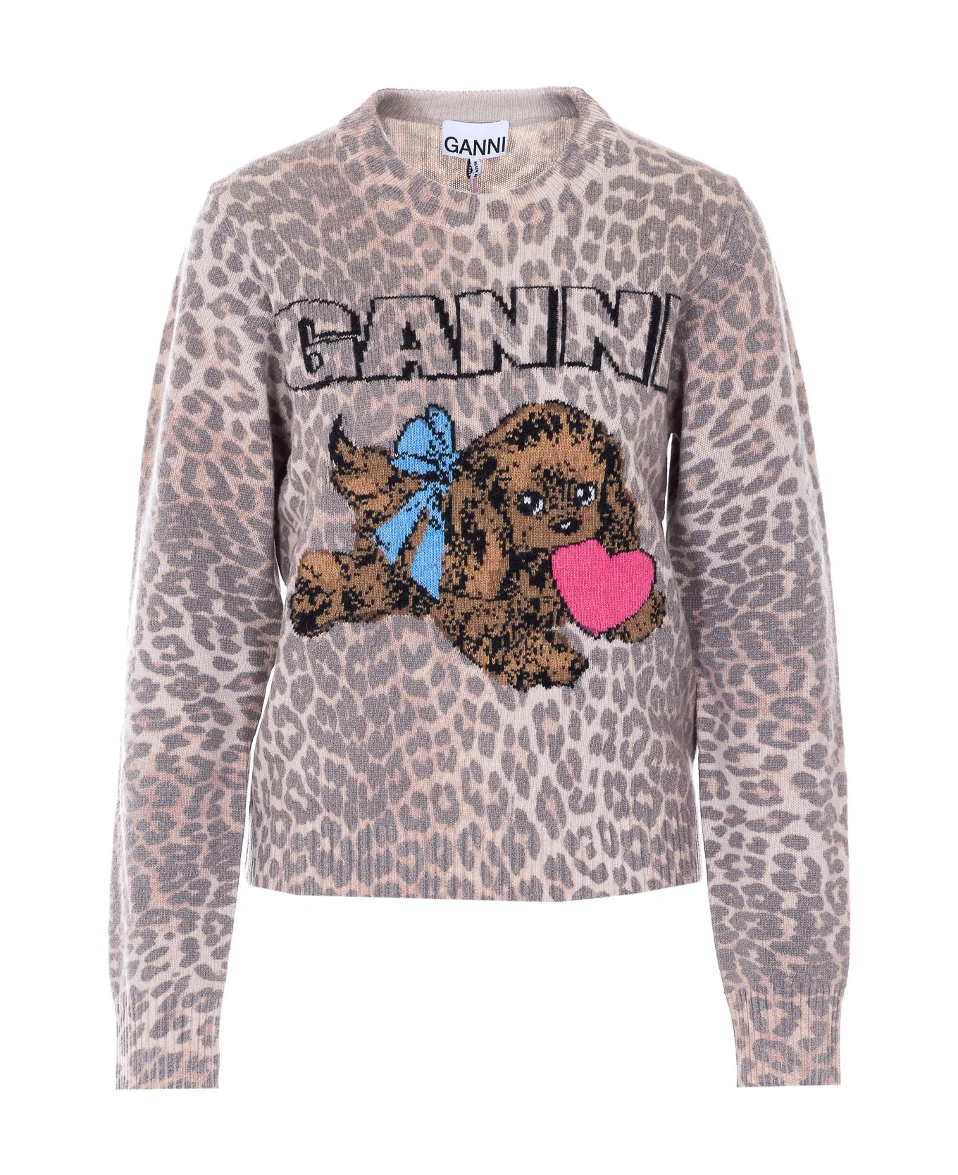 Ganni leopard graphic wool sweater, crewneck, long sleeves, embroidered logo on the front, embroidered puppy detail Composition: 45% Wool, 35% Recycled Wool, 20% Reycled Polyamide Made in: Romania Color: Brown Size and fit: - US SIZE Model number: A1070147943