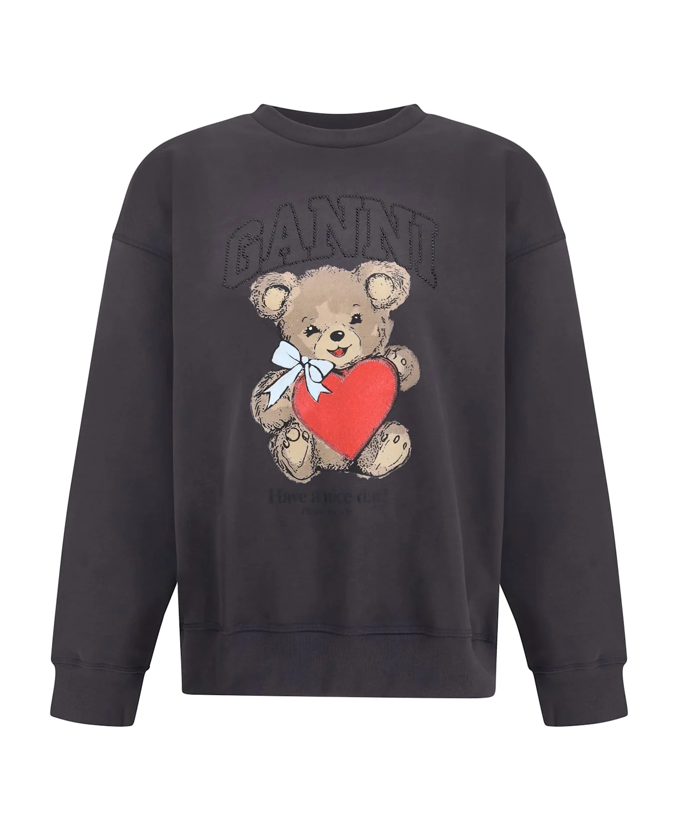 The teddy graphic sweatshirt by ganni blends comfort with playful attitude, turning a classic silhouette into a charming statement piece. the round neckline and long sleeves create a clean, relaxed shape, while ribbed trims add subtle structure. the bold teddy graphic brings a whimsical, expressive touch that reflects ganni s signature spirit. a cosy yet distinctive sweatshirt that adds character to everyday dressing. Composition: 100% % Cotton Made in: Portugal Model number: A1060027252