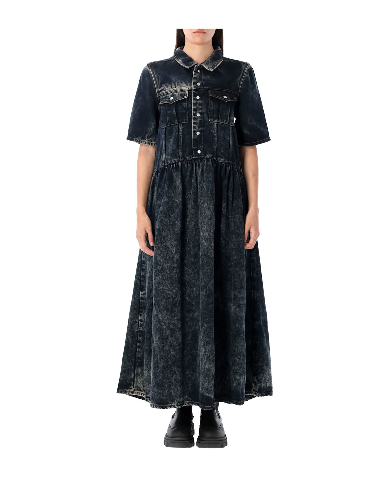 Washed Denim Maxi Dress By Ganni. Featuring: Shirt Collar Front Button Closure Short Sleeves Two Flap Buttoned Pockets At Chest Contrast Stitching Yoke Detail At Back Model Is 1,70 M And Wears Size 36 Composition: 100% tencel lyocell Made in: Tunisia Color: WASHED BLACK Model number: J17576779055