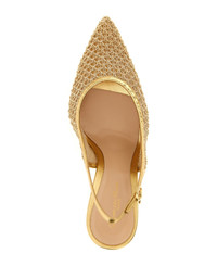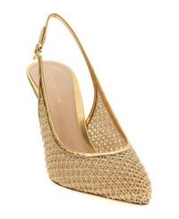 'Nikki' slingback toe, perforated workmanship and metallic leather details, adjustable strap with gold buckle. Composition: 90% fabric 10% lamb leather Made in: Italy Color: Gold Size and fit: - EU WOMEN Heel: 12 cm Model number: G9562895RICINKMEKM