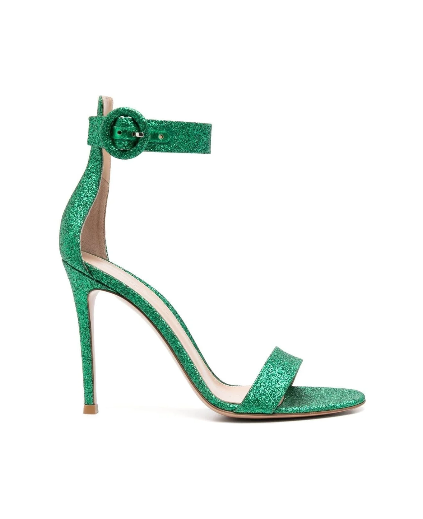Portofino 105mm glitter sandals from GIANVITO ROSSI featuring bright green, calf leather, glitter detailing, single toe strap, open toe, buckle-fastening ankle strap, branded leather insole and high stiletto heel. Composition: Outer: Calf Leather, 100% , Glitter, 100% Sole: Calf Leather, 100% Lining: Calf Leather, 100% Made in: Italy Color: Green Size and fit: - Heel 4,1 in / 10,5 cm Model number: G6109615RICSTHGREE