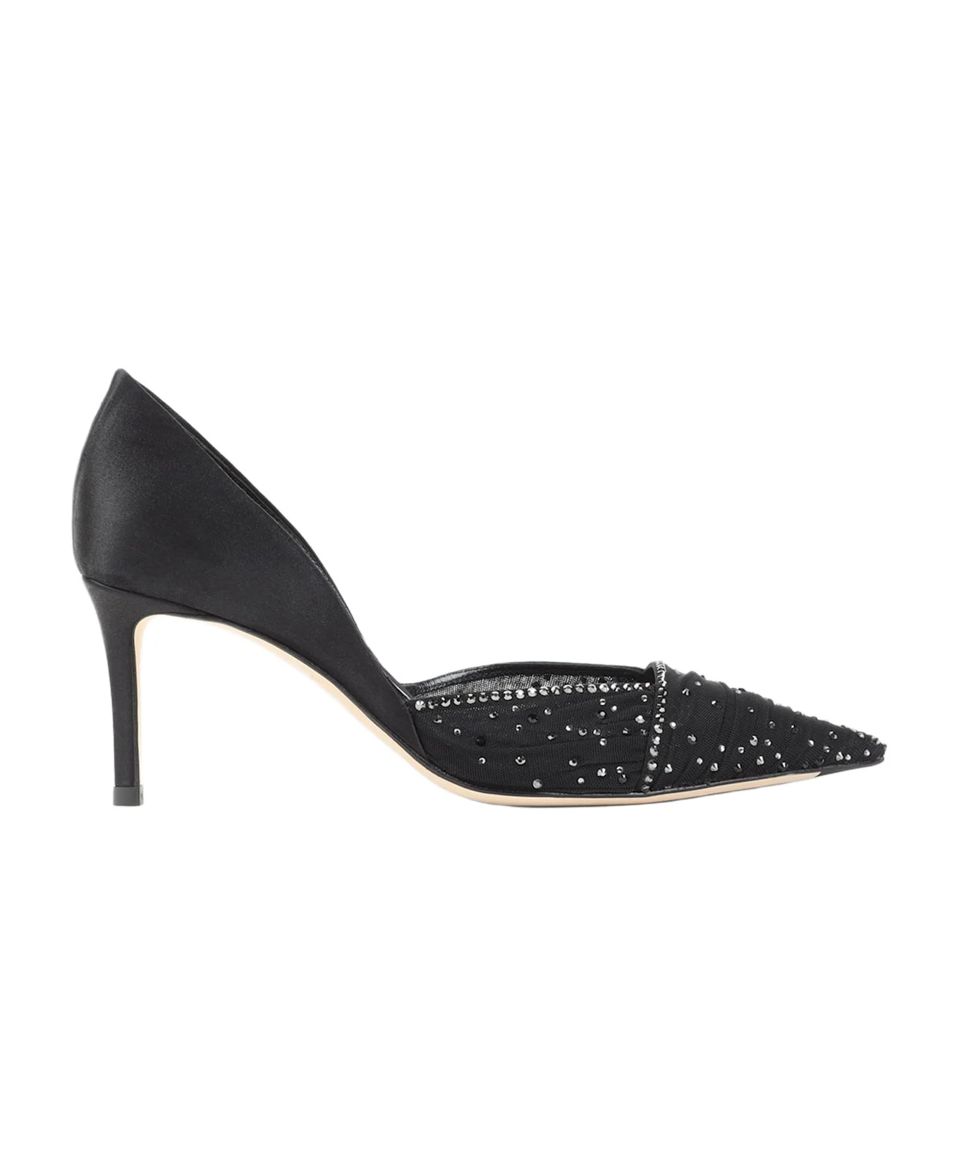 Giorgio Armani Black Satin and Tulle Decollete. Black satin and tulle upper embellished with bright rhinestones. Pointed toeline, covered stiletto heel, leather sole and insole. Made in: Italy Color: Nero Size and fit: - Heel high: 7cm Model number: GW001909AF23775MC570