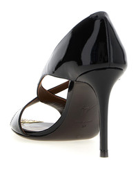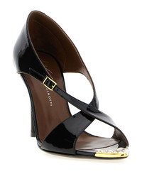 'Intrigo' patent leather sandals with pointed toe cap in metal with rhinestones and baguettes set, adjustable side strap, stiletto heel, leather sole. Composition: 100% calfskin leather (Bos Taurus) Made in: Italy Color: Black Size and fit: - EU WOMAN - Heel: 10.5 cm Model number: I500022001