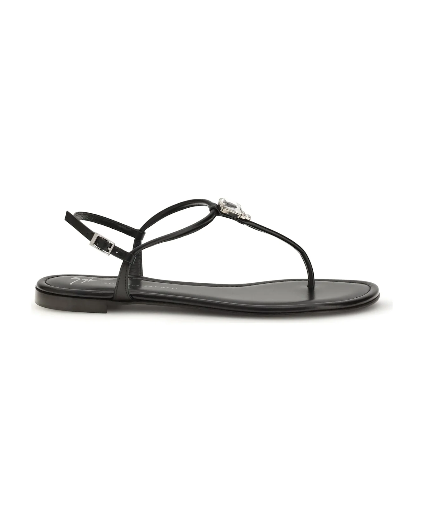 The pia mizuki sandals by giuseppe zanotti are leather flip-flops embellished with an elegant rhinestone detail. the adjustable strap with metal buckle ensures a stable fit, while the leather-covered insole offers comfort and sophistication. Composition: 100% % Calf Leather Bos Taurus Made in: Italy Model number: E600011002