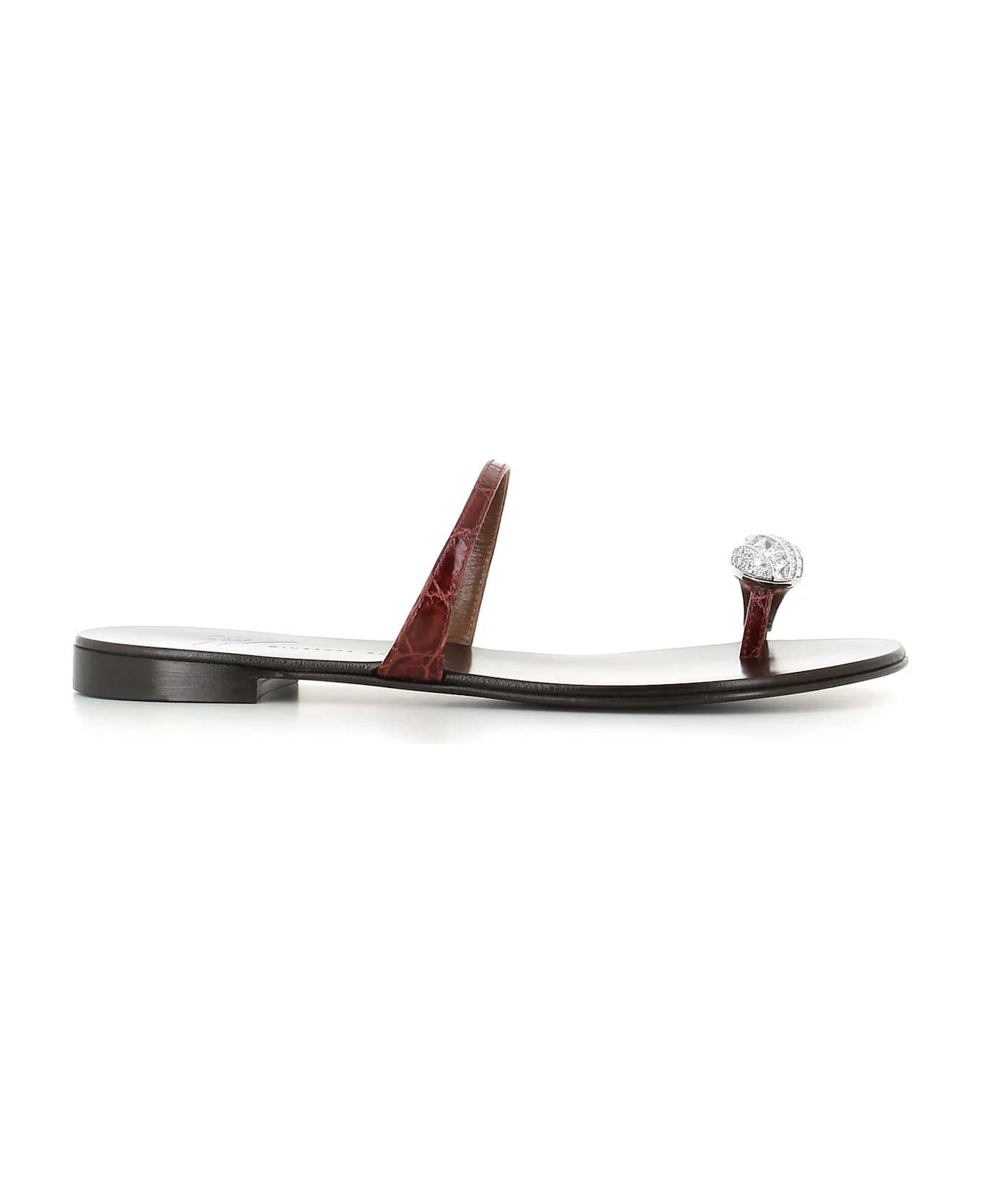 Dark brown women's leather jewel sandals by Giuseppe Zanotti, feauturing by a silver ring and a thin rephtile print strap. Leather sole. Heel: 1,5 cm Composition: Leather Made in: Italy Color: Bordeux Size and fit: - Fits true to size. Model number: I500000005GANA55