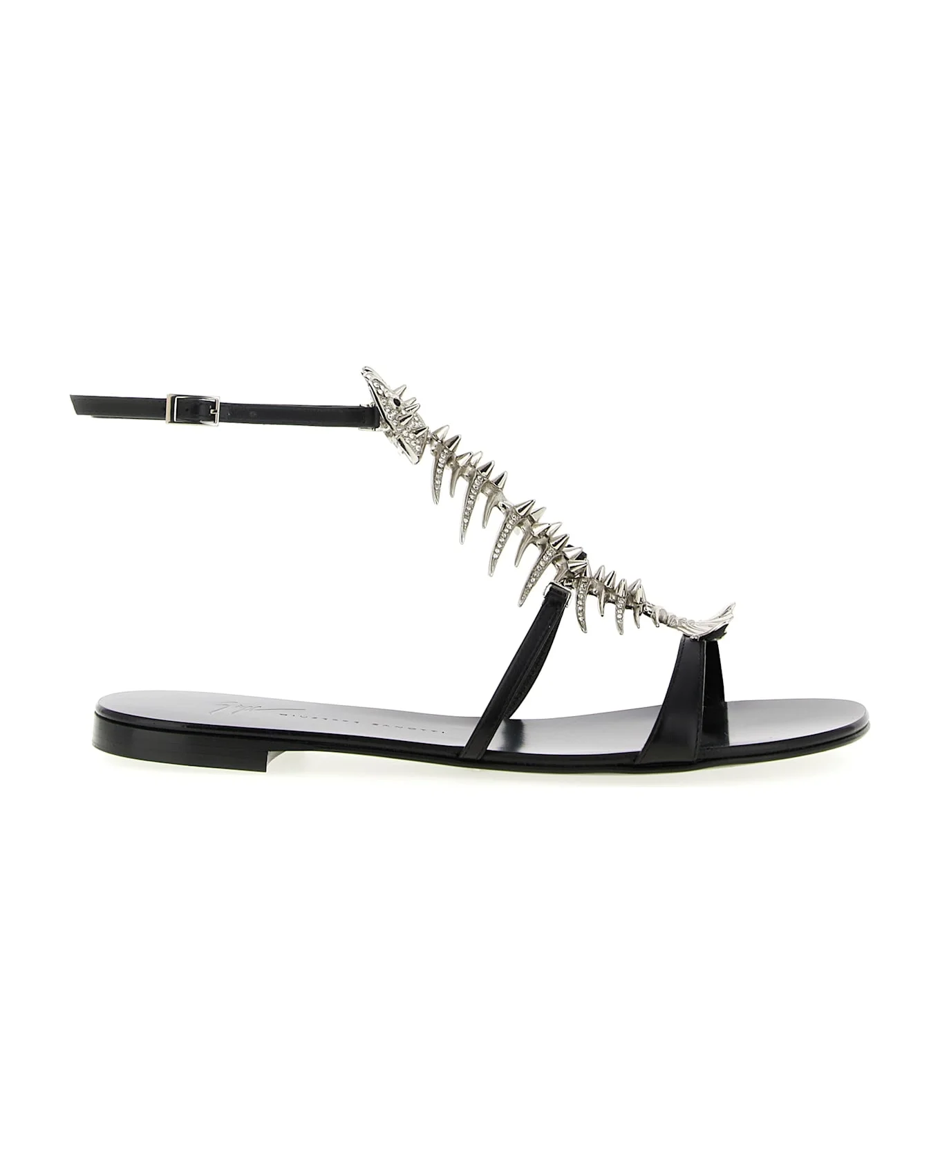 'Slim' low style sandals with straps and 'lisca di pesce' metal front detail with studs and rhinestones, adjustable ankle strap with buckle. Composition: 100% lamb leather (Ovis aries) Made in: Italy Color: Black Size and fit: - EU WOMEN Model number: E600029001