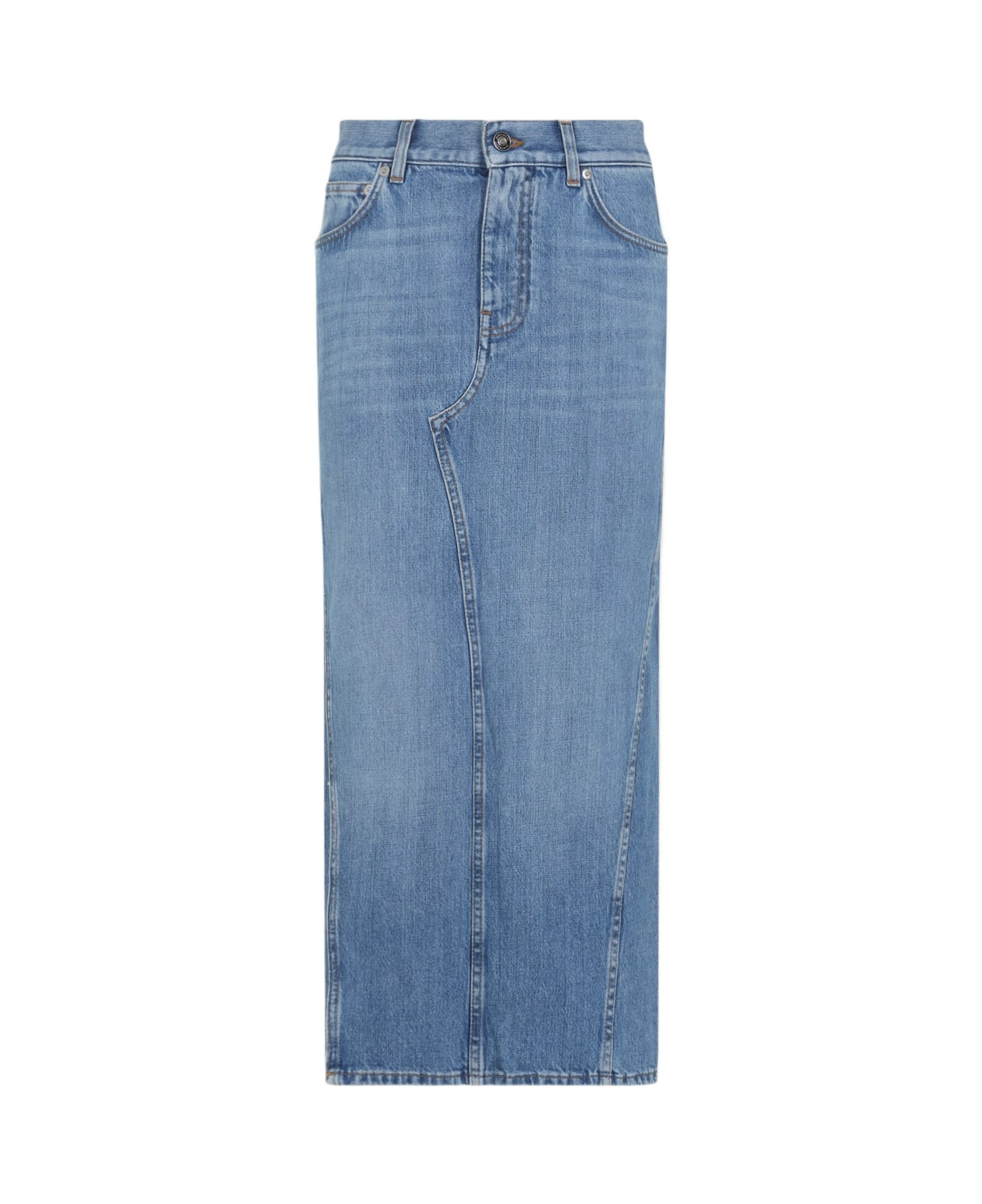 Givenchy Medium Blue Cotton Midi Skirt. Medium blue cotton denim, pencil skirt desing, mid-waist, belt loops, 5-pocket design, front button and fly-zip design, asymmetric stitchings on the front, straight hem. Made in: Romania Color: Medium Blue Model number: BW40Z9516F420