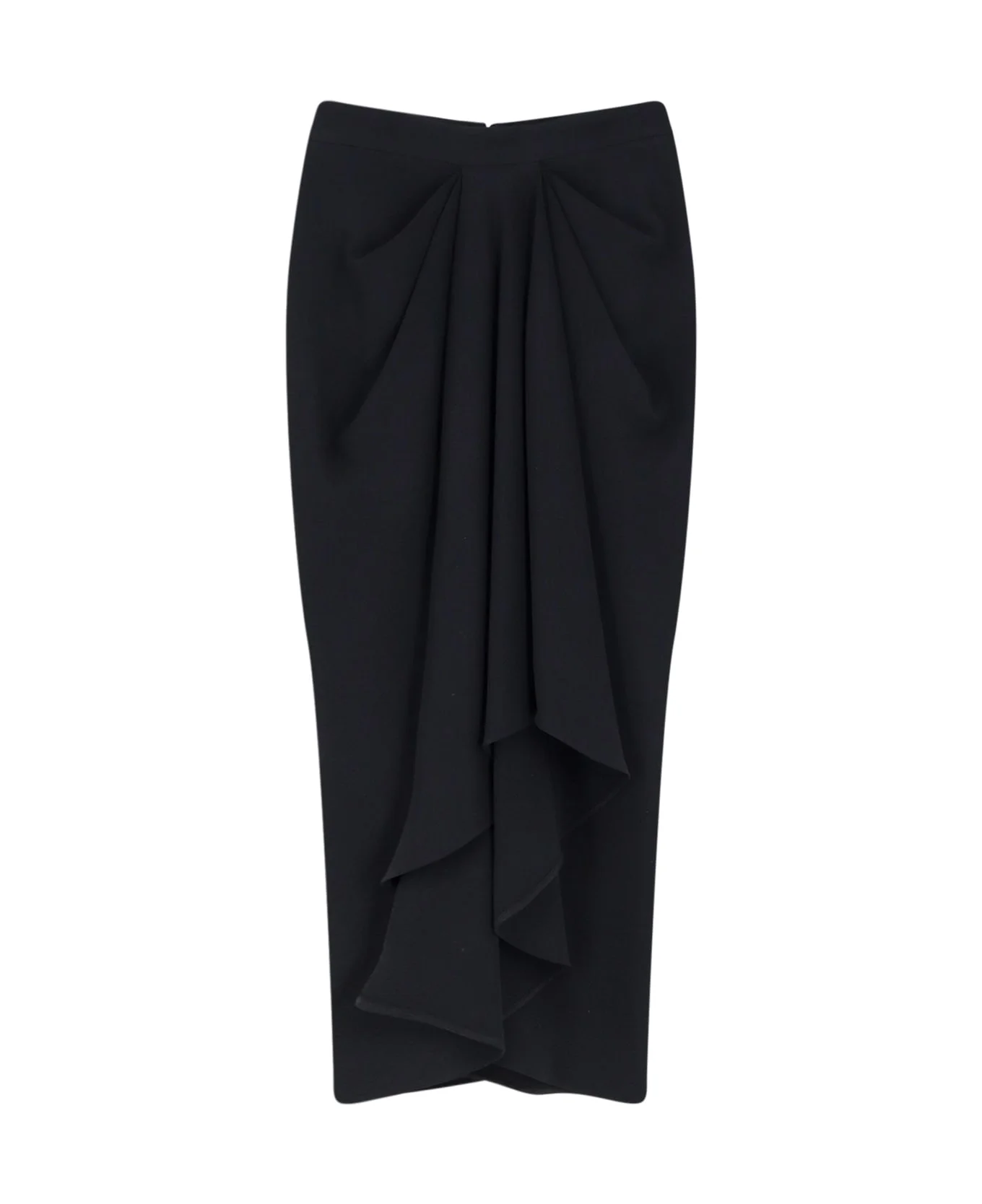 High-waisted Back zip closure Front drapery Asymmetrical bottom Made in Italy 65% viscose, 32% acetate, 3% elastane SKU: BW411M164K001 Made in: Italy Color: Black Model number: BW411M164K001