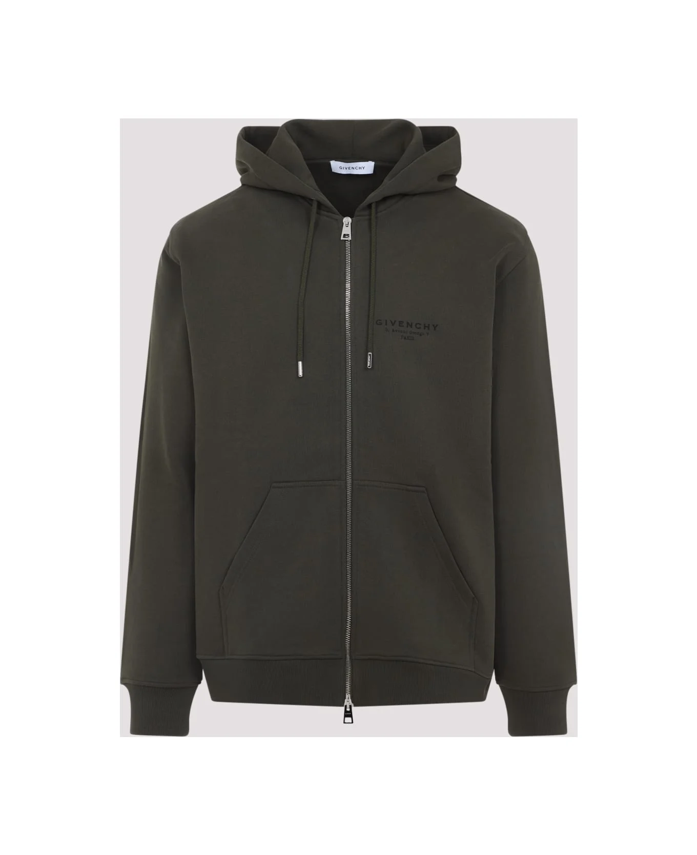 Givenchy Khaki Green Cotton Sweatshirt. Pure khaki green cotton sweatshirt, tonal hood, front drawstring details, front zipped fastening, chest black lettering logo, side pockets, long sleeves, ribbed cuffs and hem, straight hem. Made in: Portugal Color: Green Model number: BMJ0NJ3YRJ305