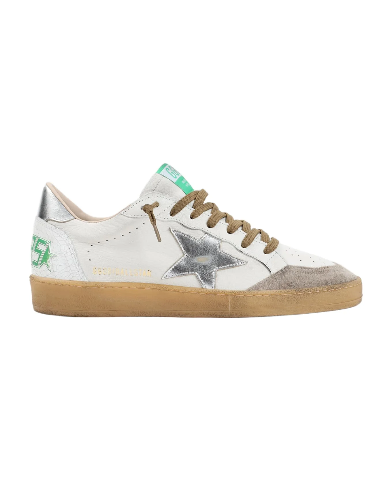 Golden Goose White Goat Leather Ballstar Sneakers. Crafted in goat leather and cow leather. Round toe with grey detail, top lace-up fastening, green patch logo on the tongue, side signature grey star detail, side gold-tone lettering logo, perforated details on the upper, back silver detail, back green logo, brown rubber sole. Overused effect. Made in: Italy Color: White Beige Silver Model number: GMF00117F00816310414