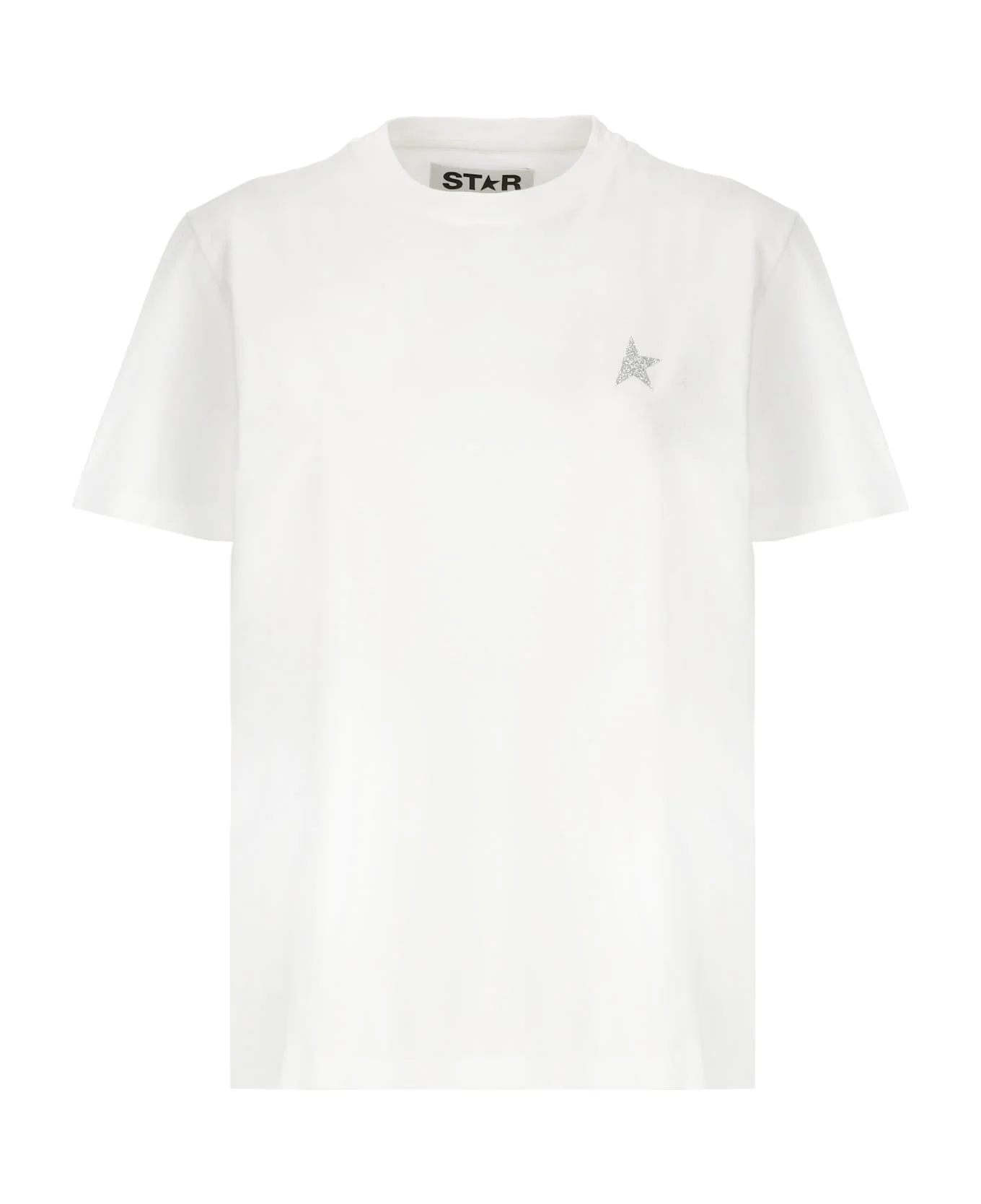 - White Golden Goose cotton t-shirt for woman - Crew neckline - Short sleeves - Front contrasting color iconic glittered star Composition: 100% Cotton Made in: Italy Color: White Size and fit: - Model's height is 179 cm and she wears a size M Model number: GWP01220P00059480185STARWS