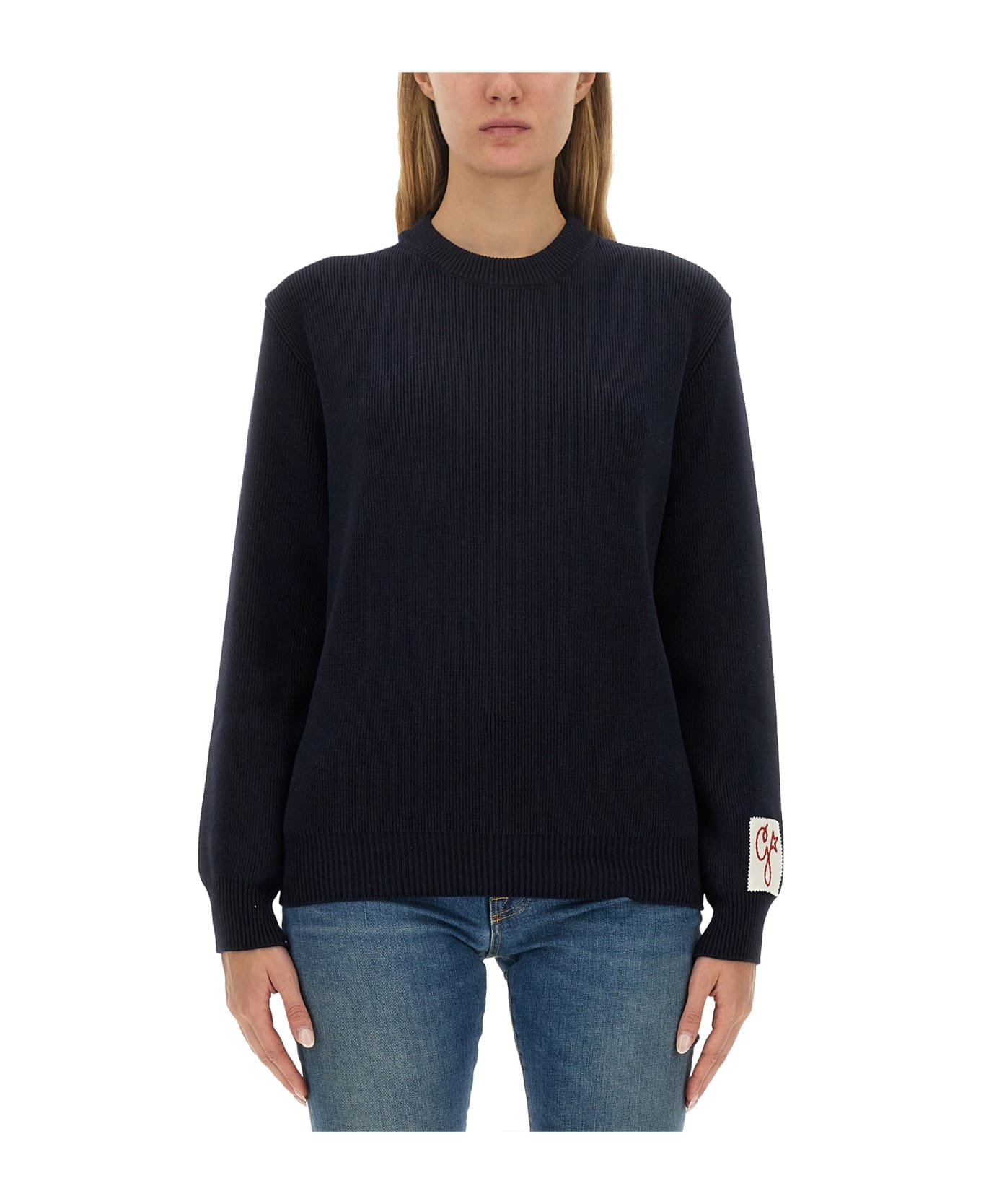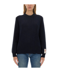 Women’s round-neck sweater in dark blue cotton with logo on the back