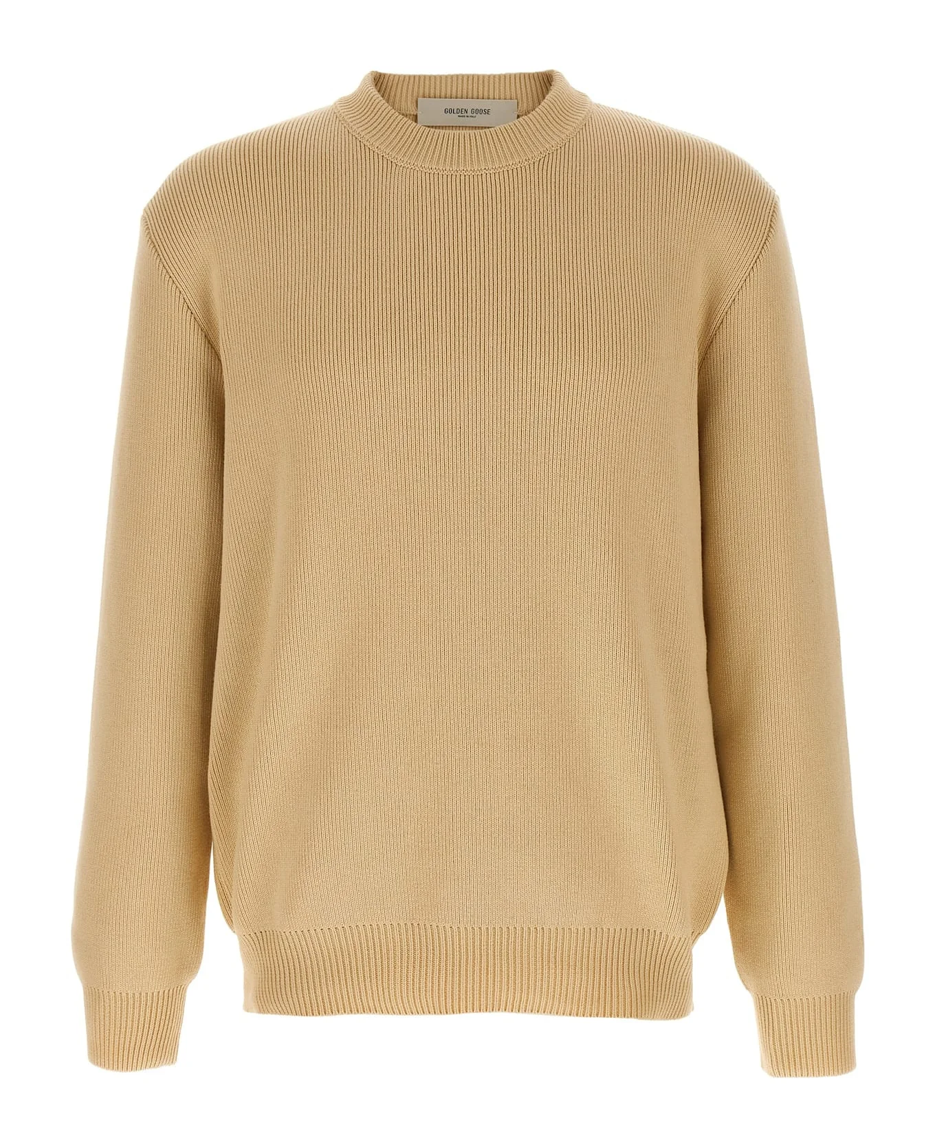 Men’s beige crew neck sweater with ‘Golden’ lettering on the back