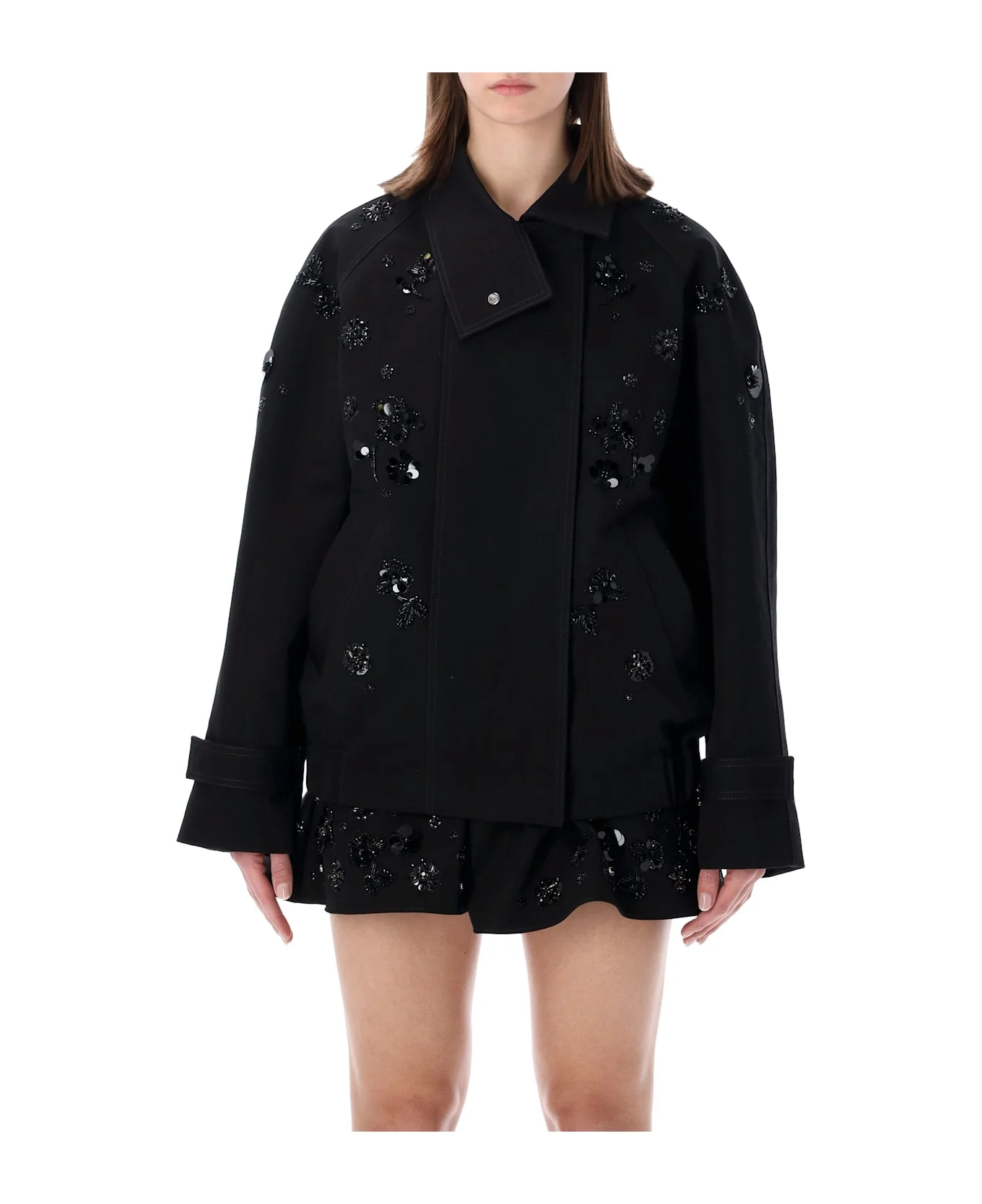 Women’s oversized jacket in black cotton twill with floral sequin embroidery