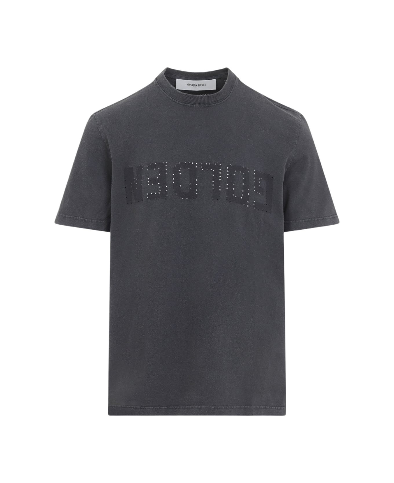 Golden Goose Gray Cotton Golden Regular T-Shirt. Gray Cotton, crew neckline, short sleeves, straight hem, golden lettering on chest with perforated details, regular fit. Logo patch on bottom front. Made in: Italy Color: Anthracite Model number: GMP01220P00067160318