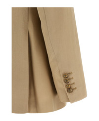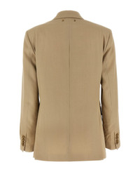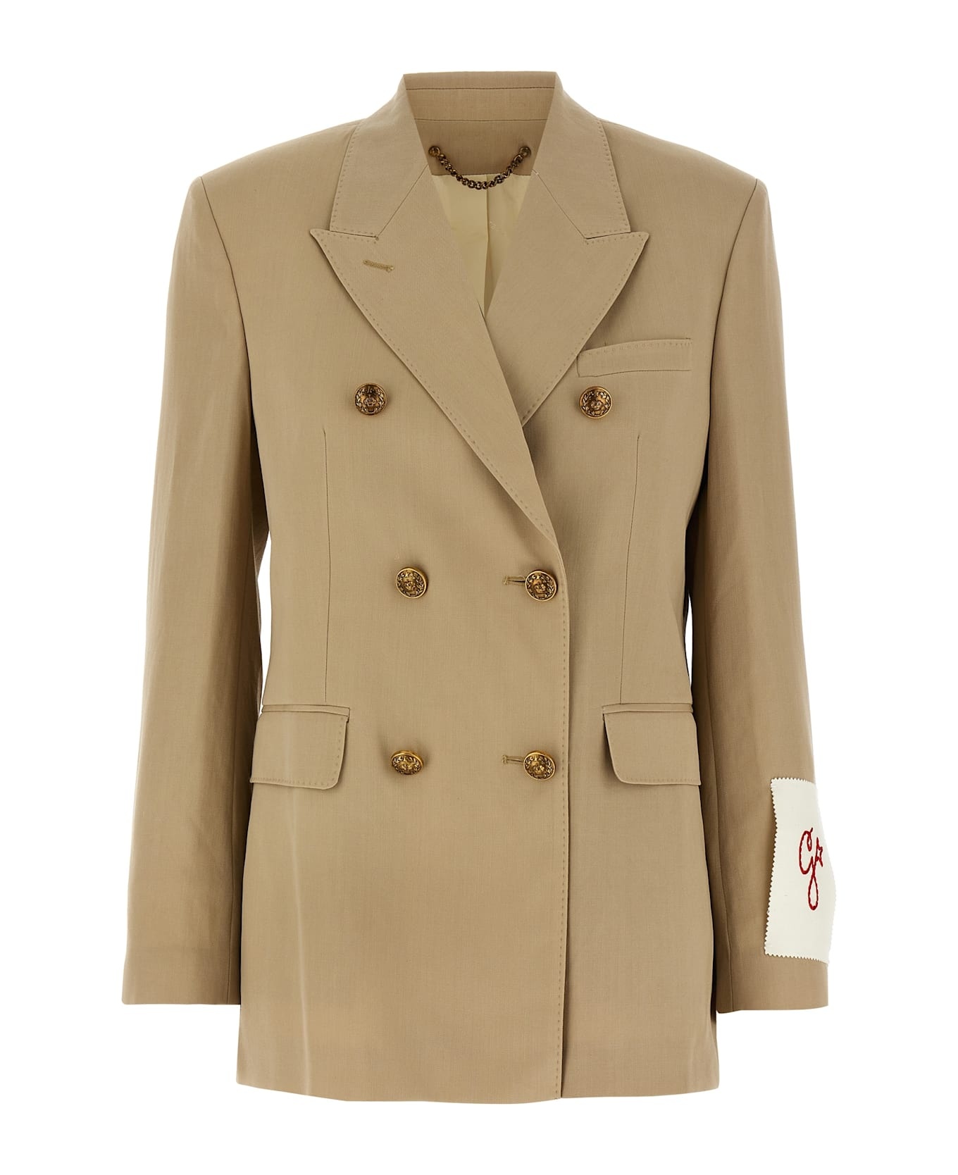Double-breasted wool blazer with front heraldic button closure, viscose blend lining with written print, peak lapels, pockets, long sleeves with logo patch, side slits, slightly padded shoulders. Composition: 100% virgin wool Made in: Italy Color: Beige Size and fit: - true to size fit Model number: GWP00829P0012671527215272