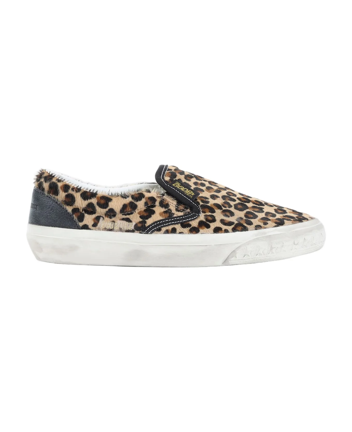 Golden Goose Brown Cow Leather Leopard Slip-On Sneakers. Pure cow leather sneakers, round toe, side patch logo, slip-on style, back black detail, back engraved logo, white sole. Brown leopard leather on the upper. Made in: Italy Color: Black Brown Model number: GWF00306F00694890301