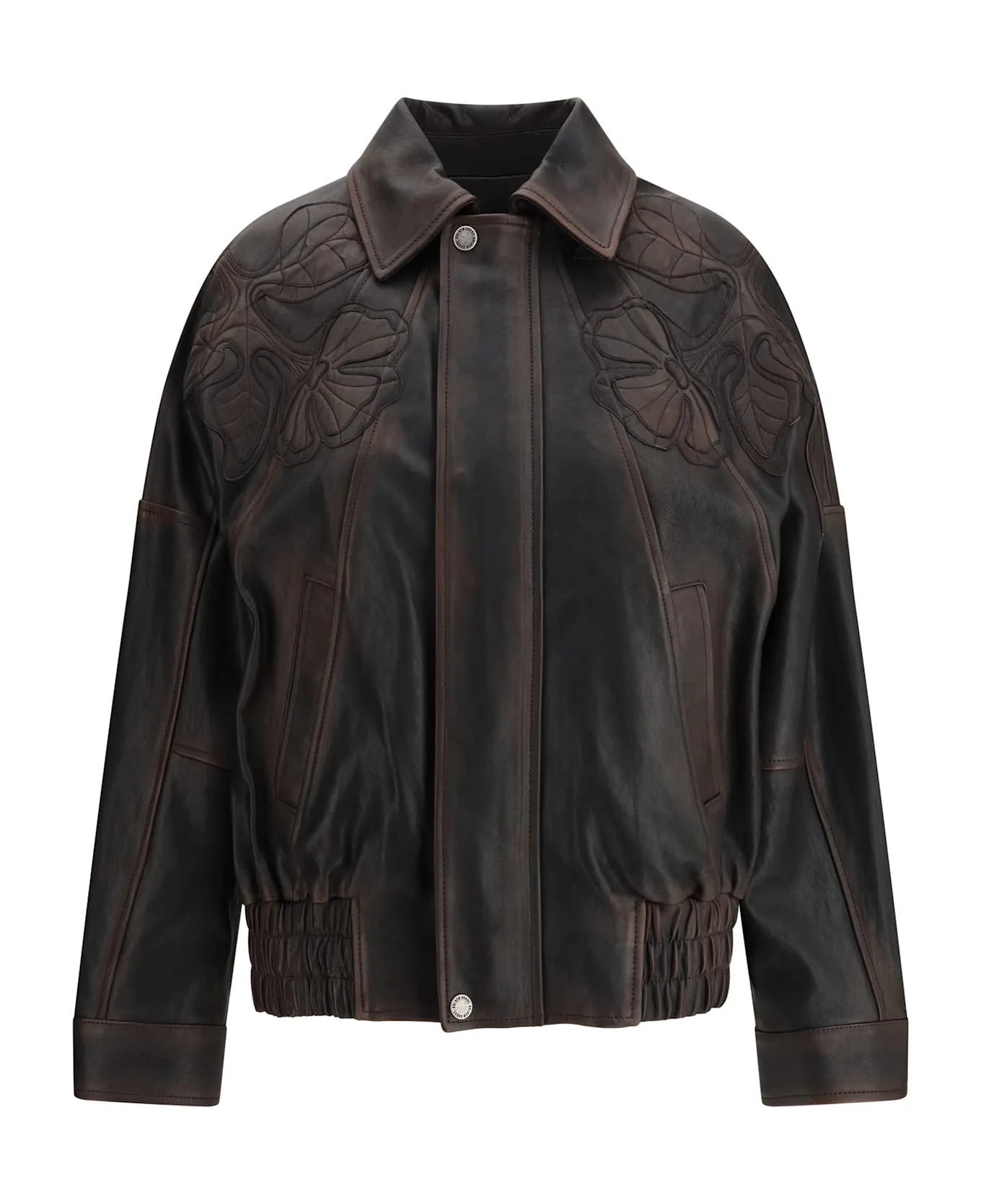 Women's bomber jacket in dark burgundy nappa leather with floral embroidery
