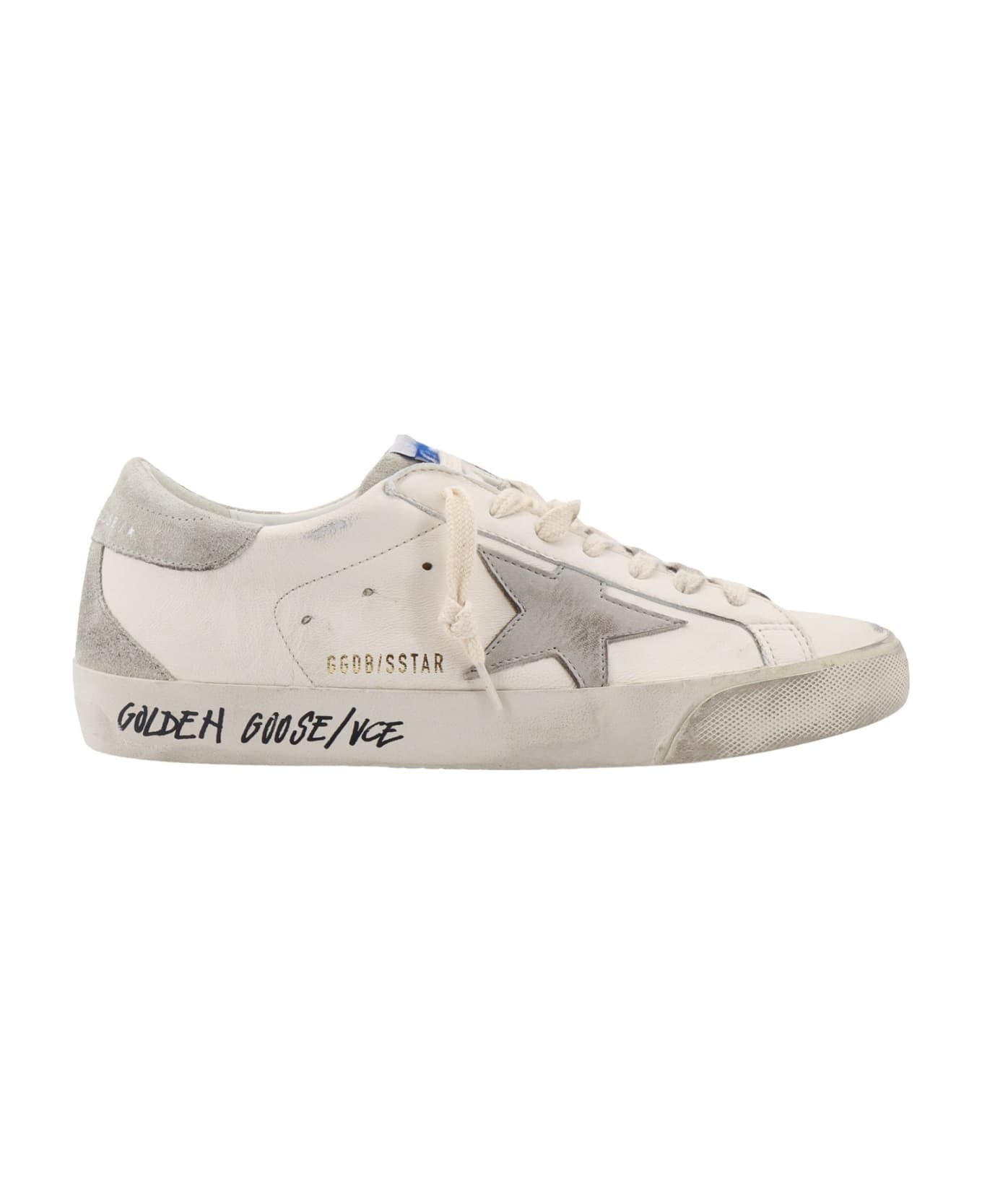 Super-star Sneaker By Golden Goose. Featuring: Low-top Lace Closure Star Logo At Side Suede Insert At Heel Tab Vintage Finish Composition: Upper ovine leather, 69% cow leather, 31% Lining cotton, 41% cow leather, 31% polyurethane textile, 18% poliester, 6% viscose, 4% Sole rubber, 100% Composition: 31% Cow Leather, 69% Ovine Leather Made in: Italy Color: White Size and fit: - HEEL: 3.0 Centimetres - Sole height: 2.5 Centimetres Model number: GMF00102F00535911166