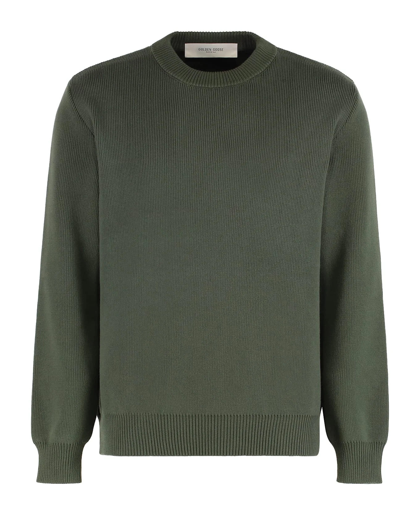 Men's military green crew neck sweater with 'Golden' lettering on the back