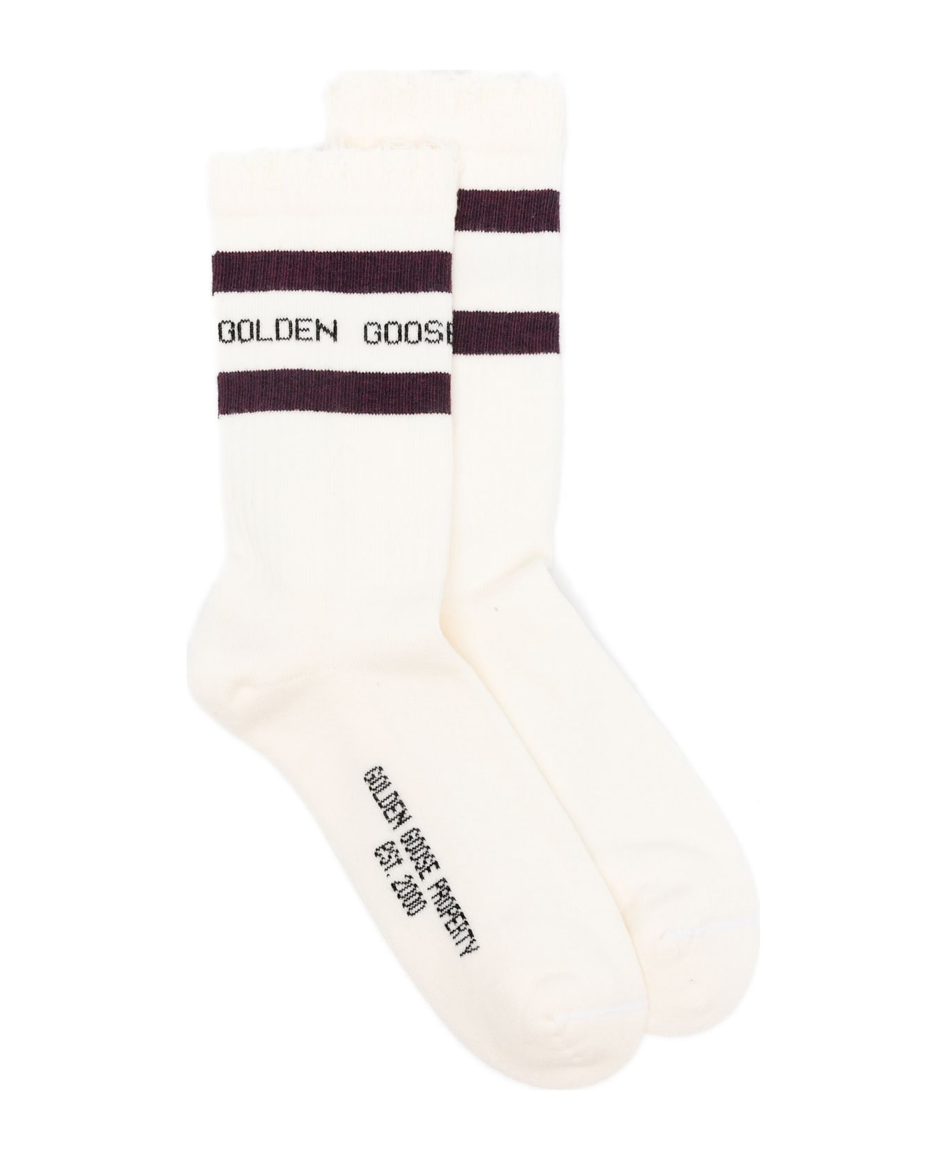 Worn-white socks with distressed details and brown stripes