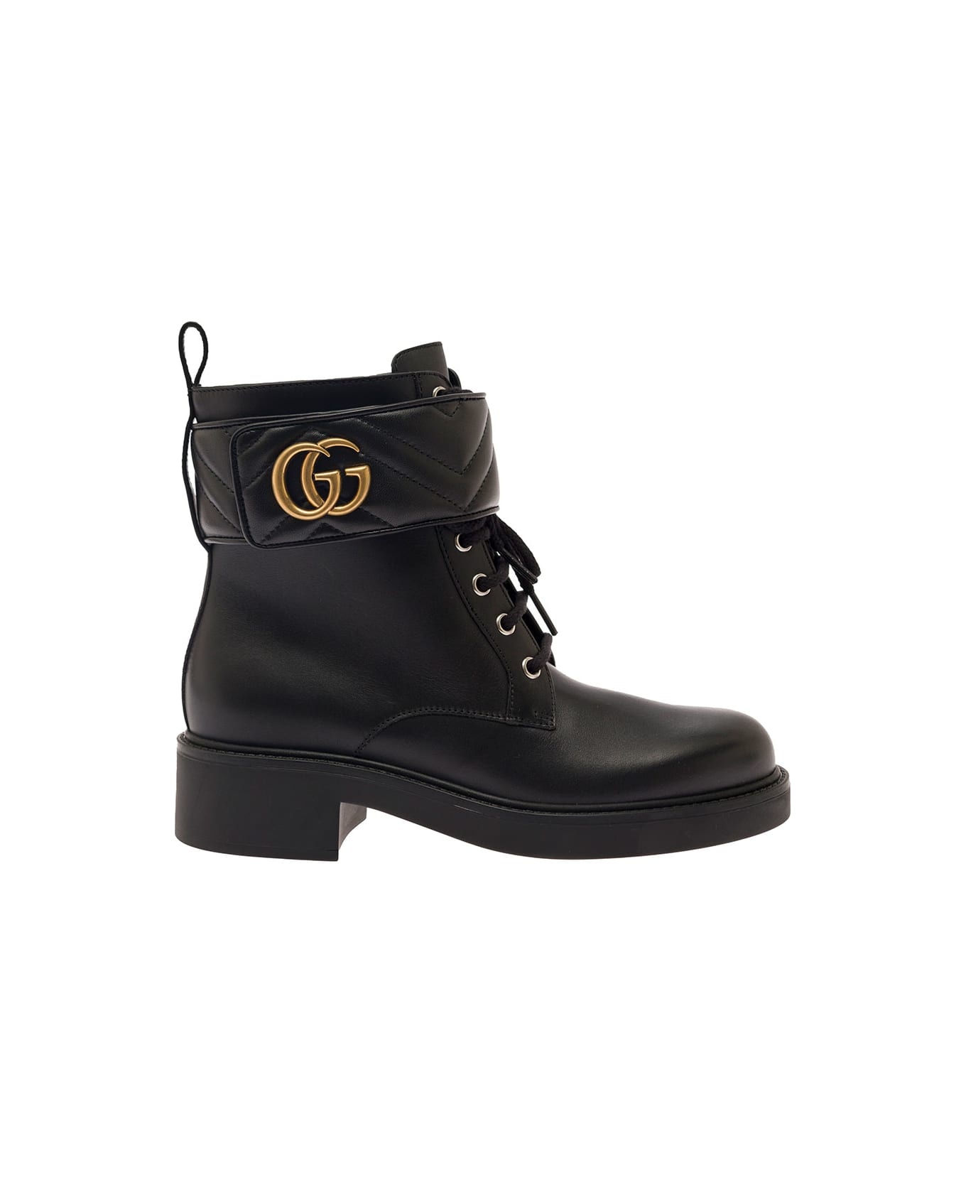 Black Ankle Boot With Double 'g' And Textured Hardware In Leather Woman