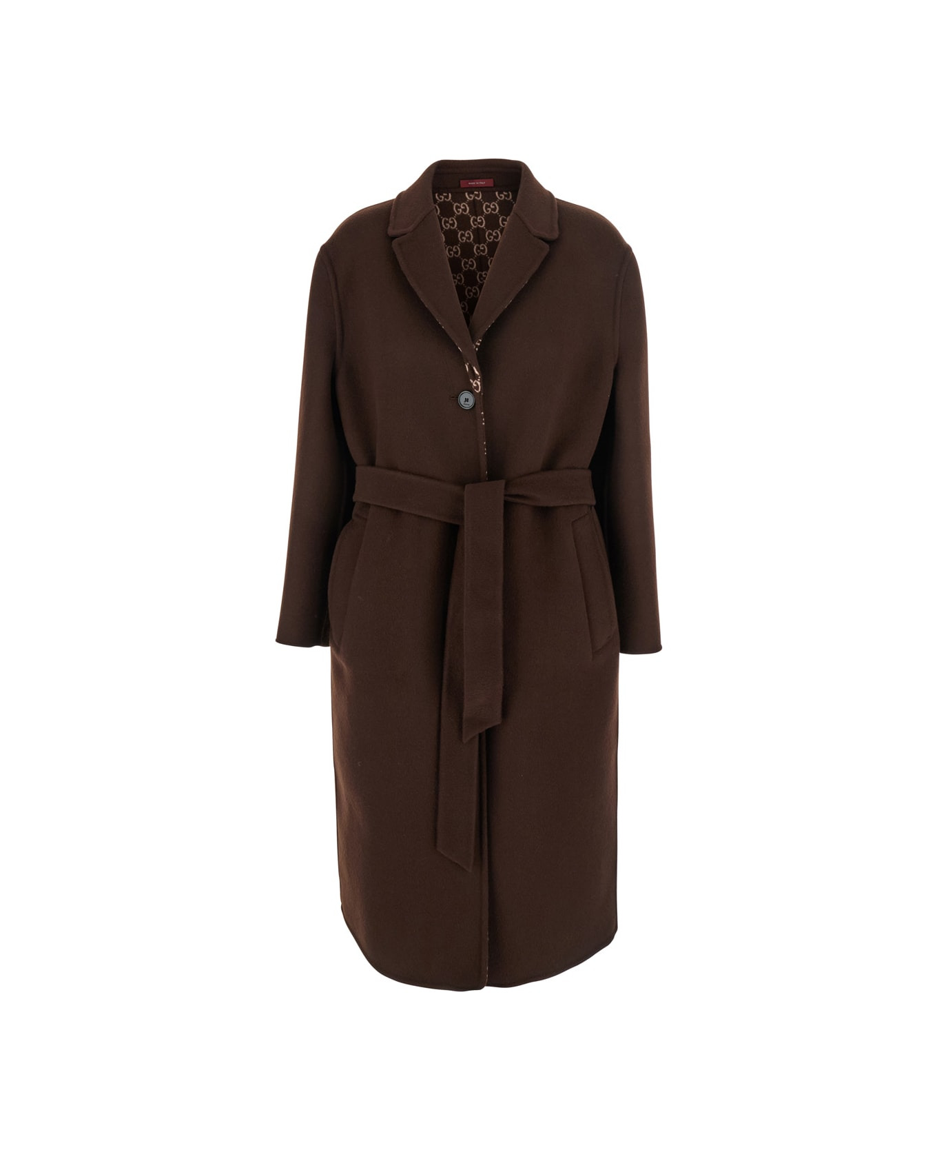 Coat Brown Double-breasted Notched revers Long sleeves Belt Two front welt pockets Straight hem Reversible design All-over GG motif Wool Regular fit Composition: Made in: European Union Color: Brown Model number: 8238397ZASL2016