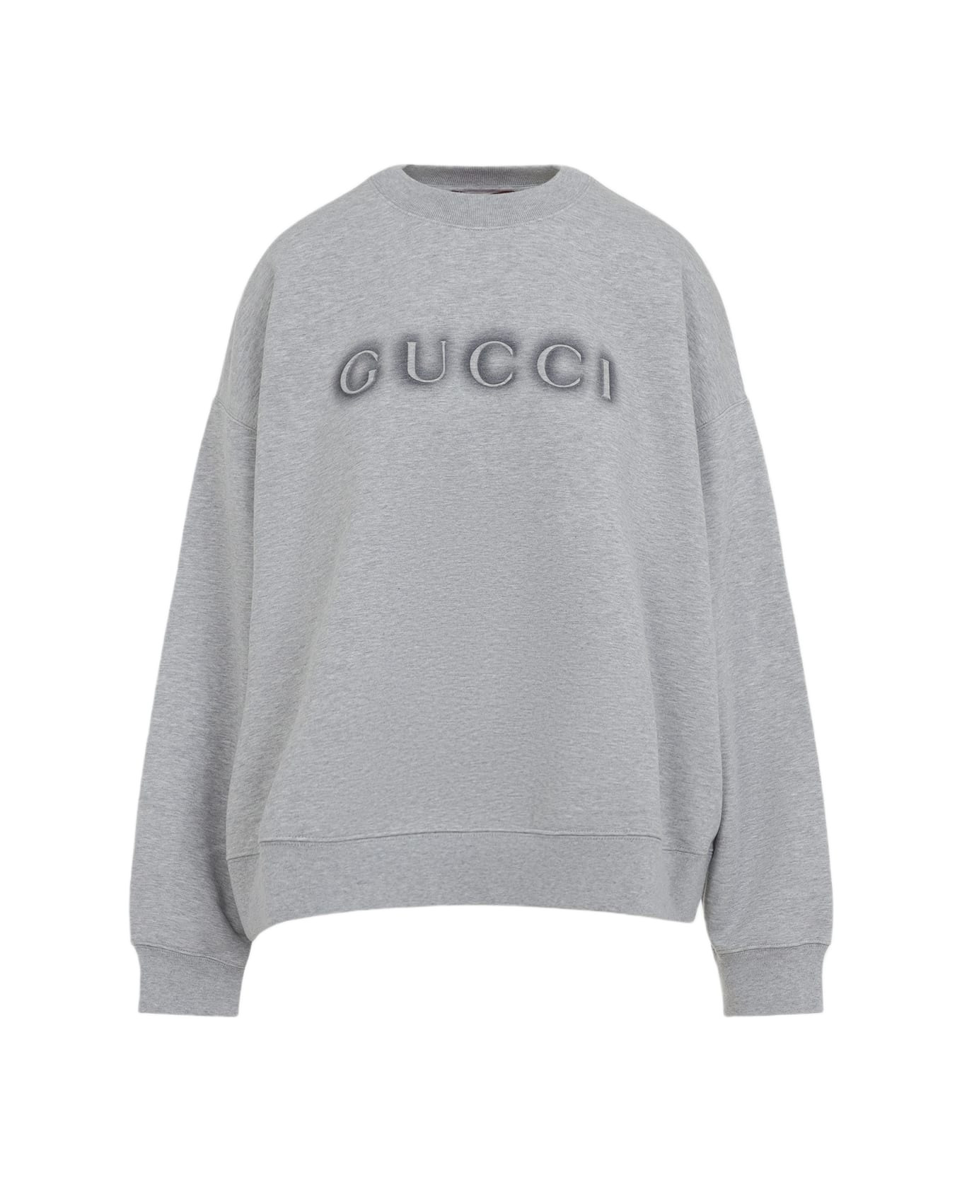 Gucci Grey Cotton Sweatshirt. Crafted from melange grey cotton, round neckline, logo stamped on the chest, dropped shoulders, long sleeves, ribbed edges, relaxed fit. Made in: Italy Color: Grey Melange Model number: 838450XJHGI1056