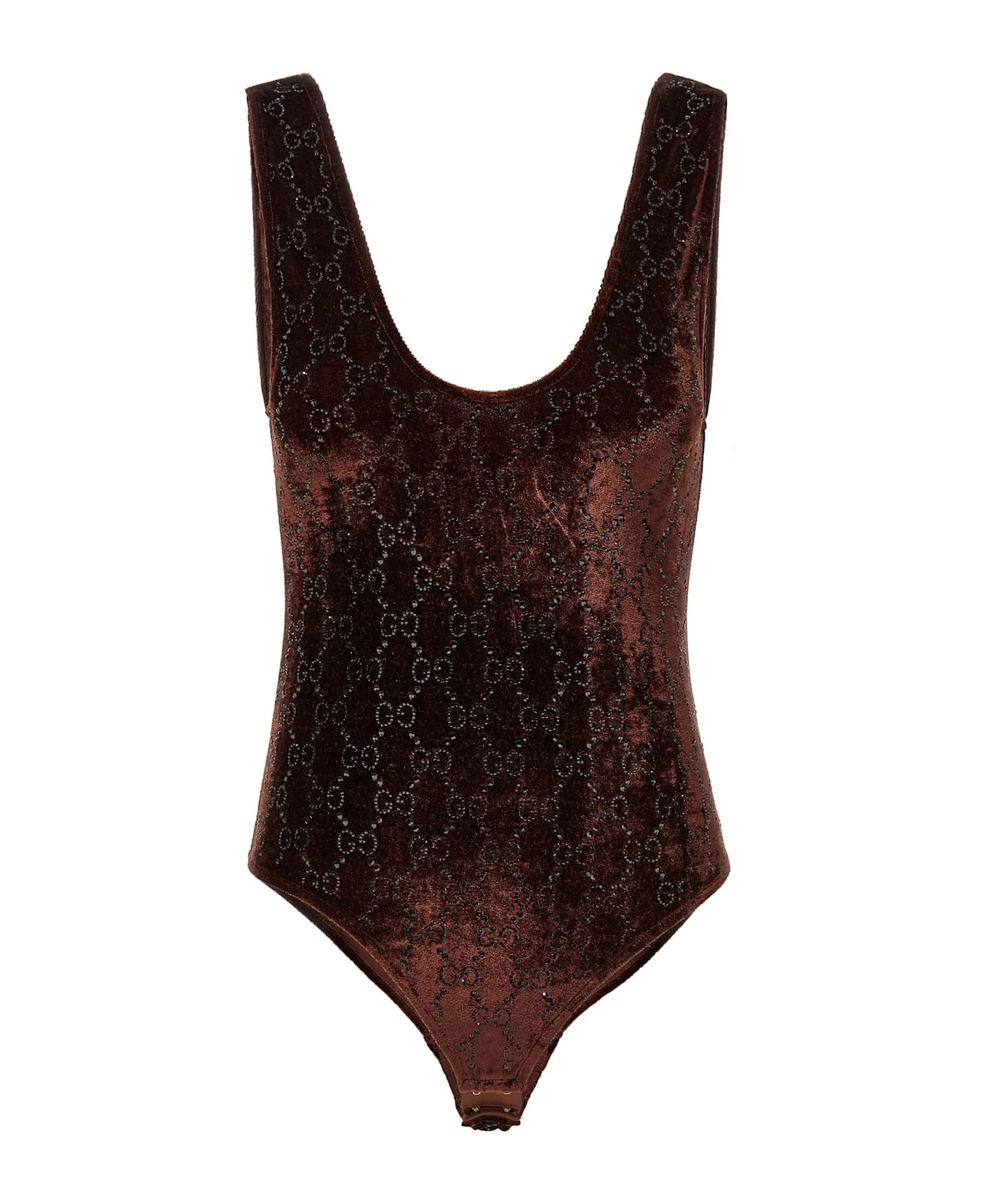 Velvet bodysuit, all-over rhinestone 'GG' pattern, deep back neckline, shoulder straps, hook closure. Composition: 100% polyamide Made in: Italy Color: Brown Size and fit: - True to size fit Model number: 850295XUANX2100
