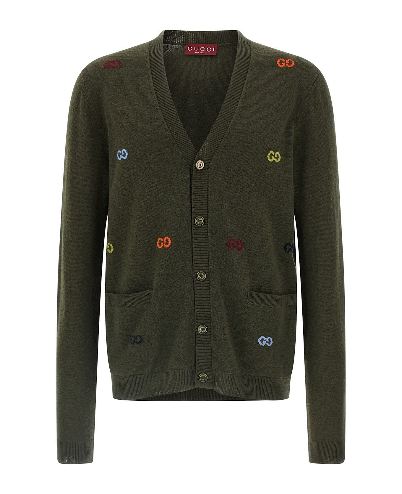 Fine cashmere cardigan with multicolored GG intarsia, V-neck, front button closure, pockets, long cuffed sleeves. Composition: 100% cashmere Made in: Italy Color: Green Size and fit: - true to size fit Model number: 833671XKEYI3018