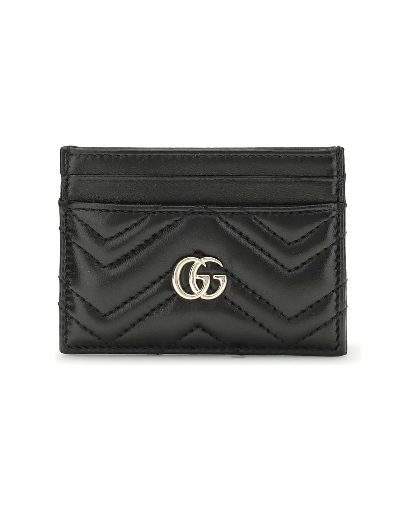 The gg marmont cardholder by gucci belongs to the iconic gg marmont line, reimagining versatile silhouettes in a palette of fresh and elegant tones. crafted from chevron matelasse leather, it features the signature double g metal detail. the interior includes four card slots and one open compartment, while the tone-on-tone fabric lining completes the timeless and sophisticated design. Composition: 100% % Lamb Ovis Aries Aries Made in: Italy Model number: 443127AAFAX1000