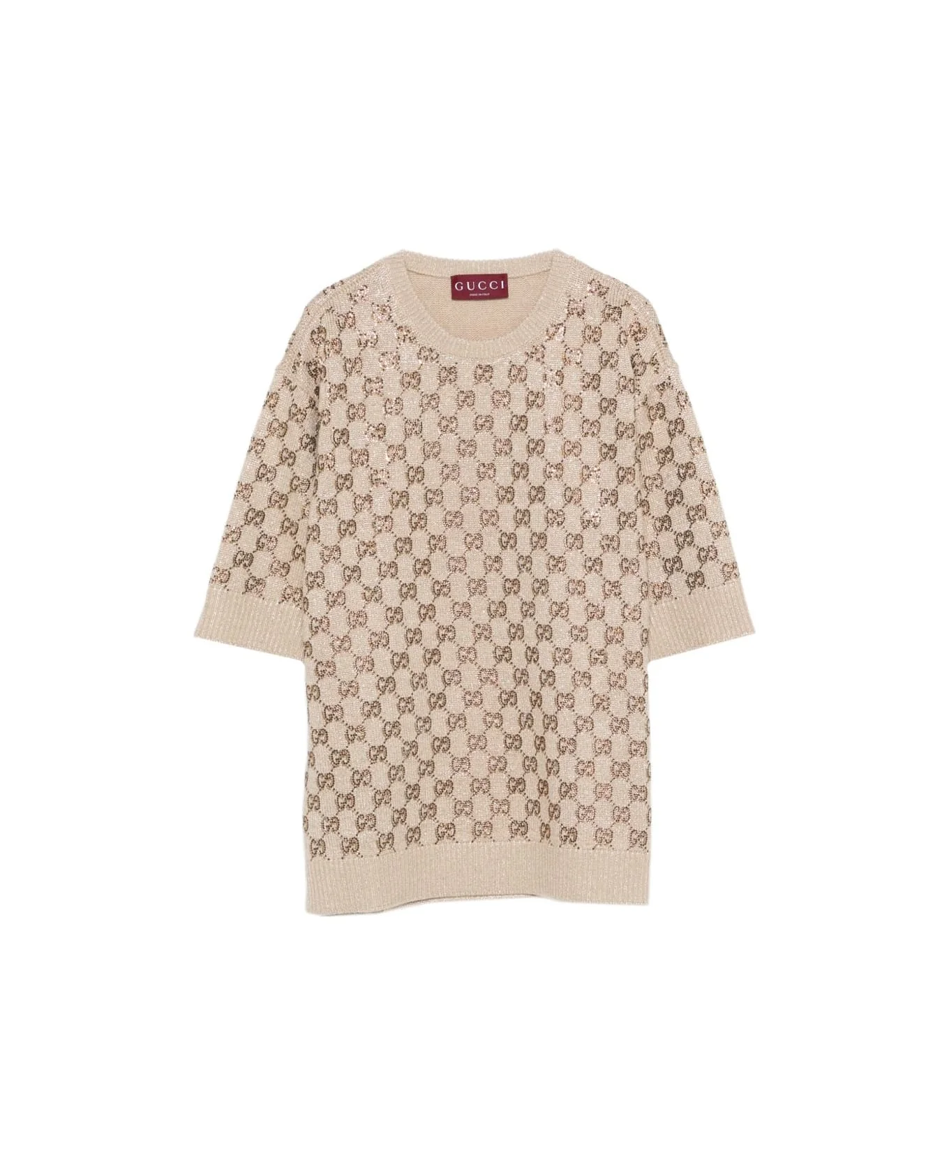Beige crew neck sweater, Gucci logo applied all over the shirt. Composition: 100% Wool Mix Made in: Italy Color: Beige Model number: 813729XKFE69322