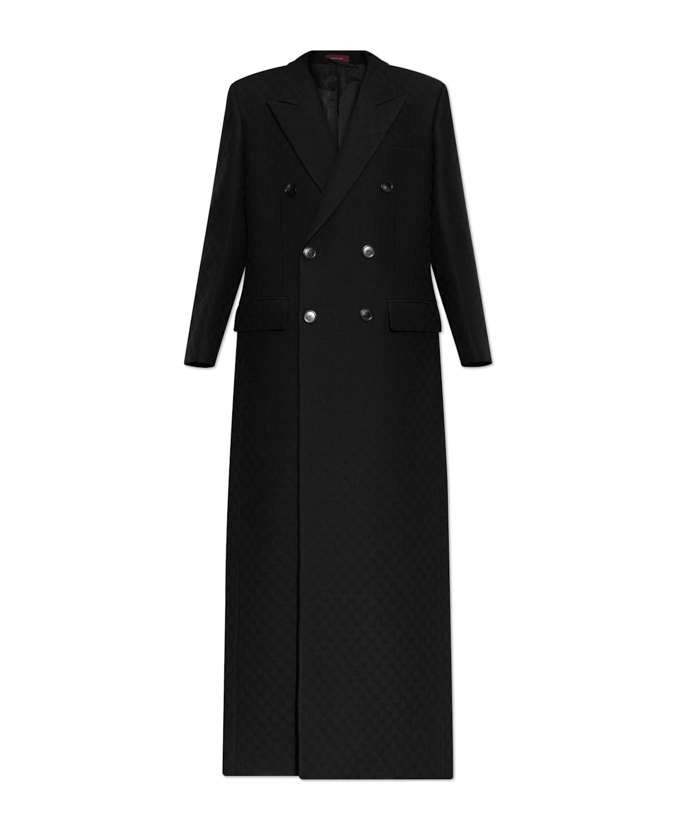 Introducing the Double-Breasted Coat with 'GG' Pattern from the illustrious house of Gucci. This coat epitomizes sartorial elegance with its classic double-breasted design and ankle-grazing length, offering a silhouette that is both timeless and sophisticated. Crafted from a sumptuous blend of wool and silk, the coat features a subtle 'GG' pattern, exuding exclusivity and refinement. Its dark hue, highlighted by the exquisite black color, ensures versatility, making it a staple for any refined wardrobe. The intricate pattern is discreet yet discernible upon closer inspection, attesting to the superior craftsmanship. The coat boasts double rows of buttons that seamlessly blend with its luxurious fabric, complemented by traditional lapels and flap pockets for added functionality. Designed under the visionary direction of creative director, this piece is a testament to Gucci's commitment to innovative luxury and unparalleled Italian craftsmanship. Why Purchase This Product? Timeless double-breasted design with a sophisticated silhouette. Exclusive 'GG' pattern for a touch of luxury. Crafted from a premium wool and silk blend for supreme comfort. Functional flap pockets enhance practicality. Versatile black color perfect for diverse styling. Composition: Inner Layer: 100% Viscose Outer Layer: 85% Wool 15% Silk Made in: Italy Color: Black Model number: 830840Z7APD1000