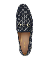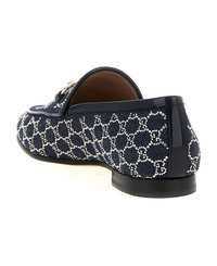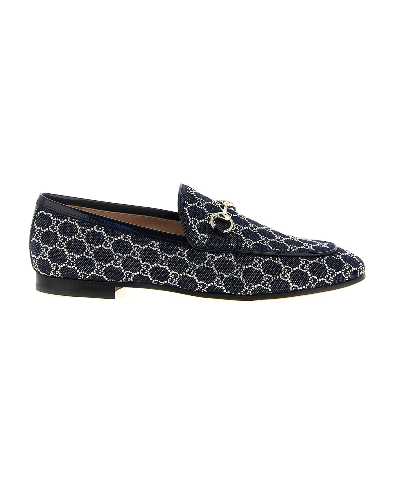 'Gucci Jordaan' cotton denim loafers with all-over GG crystals and patent details, front metal clamp, leather sole. Composition: 100% calfskin leather (Bos Taurus) Made in: Italy Color: Blue Size and fit: - EU WOMEN Model number: 836047FAEUA4051