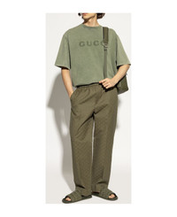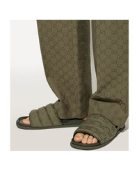 Step into refined sophistication with Gucci's Monogram Flip-Flops for men, a harmonious marriage of heritage and contemporary design. Rendered in a muted olive hue, these sandals present a rectilinear silhouette highlighted by a wide, canvas-inspired strap, embossed with the iconic interlocking GG monogram an enduring symbol of luxury and meticulous craftsmanship. The upper features a distinctive textured textile, reminiscent of jacquard, gracefully paired with an inner leather lining for enhanced comfort. A precisely contoured, flat sole crafted from premium rubber ensures durability while offering a supportive, anatomical fit. Subtle logo detailing graces the band, reflecting Gucci's unwavering attention to detail. Why choose this product? Exclusive design from the esteemed Gucci collection Elegant, subdued khaki green color for versatile styling Signature monogram embossing for a distinguished presence Superior materials textile upper, leather lining, and robust rubber sole Impeccable comfort and tailored fit for all-day wear Composition: Inner Layer: Leather Outer Layer: Fabric Sole: Rubber Made in: Italy Color: Green Size and fit: - Sole height: 2cm - Sole height at the highest point: 2,5cm Model number: 838089FAD718746