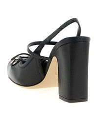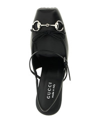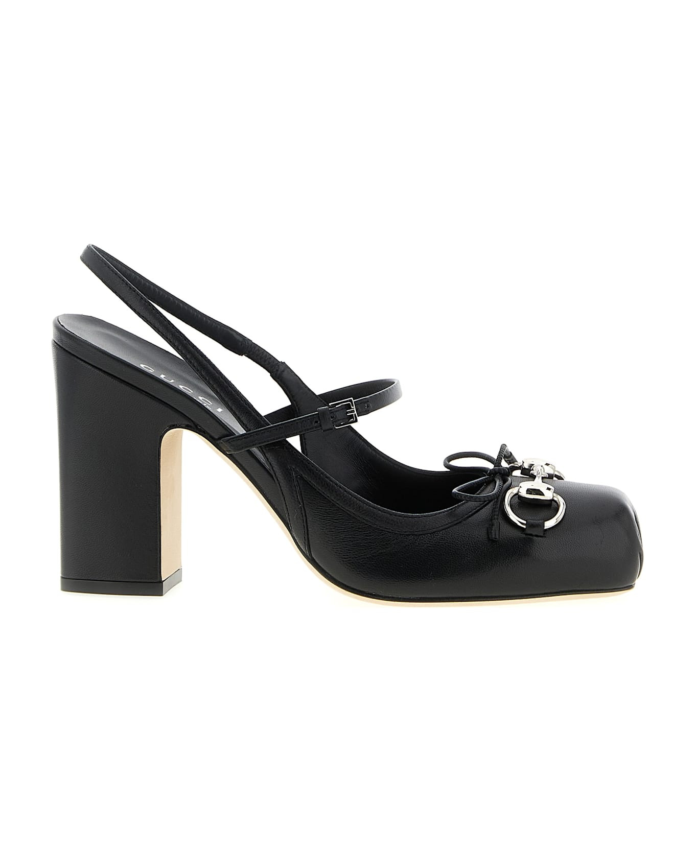 'Gucci' leather slingbacks, bag structure with squared closed toe, metal clamp detail and tone-on-tone bow on the front, adjustable strap on the instep, back elastic strap, chunky heel, leather sole. Composition: 100% lamb leather Made in: Italy Color: Black Size and fit: - EU WOMAN - Heels: 9.5 cm Model number: 845891AAFK11000