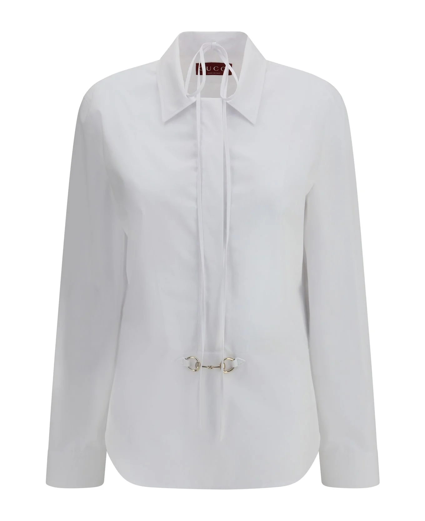 Gucci's cotton shirt is distinguished by the metal horsebit detail on the front, a tribute to the house's equestrian heritage. elegant and refined, it features a pointed collar with ties to tie at the neck, partial concealed button closure and buttoned corner cuffs for a sophisticated look with distinctive character. Composition: 100% % Cotton Made in: Italy Color: White Model number: 831912Z8B2P