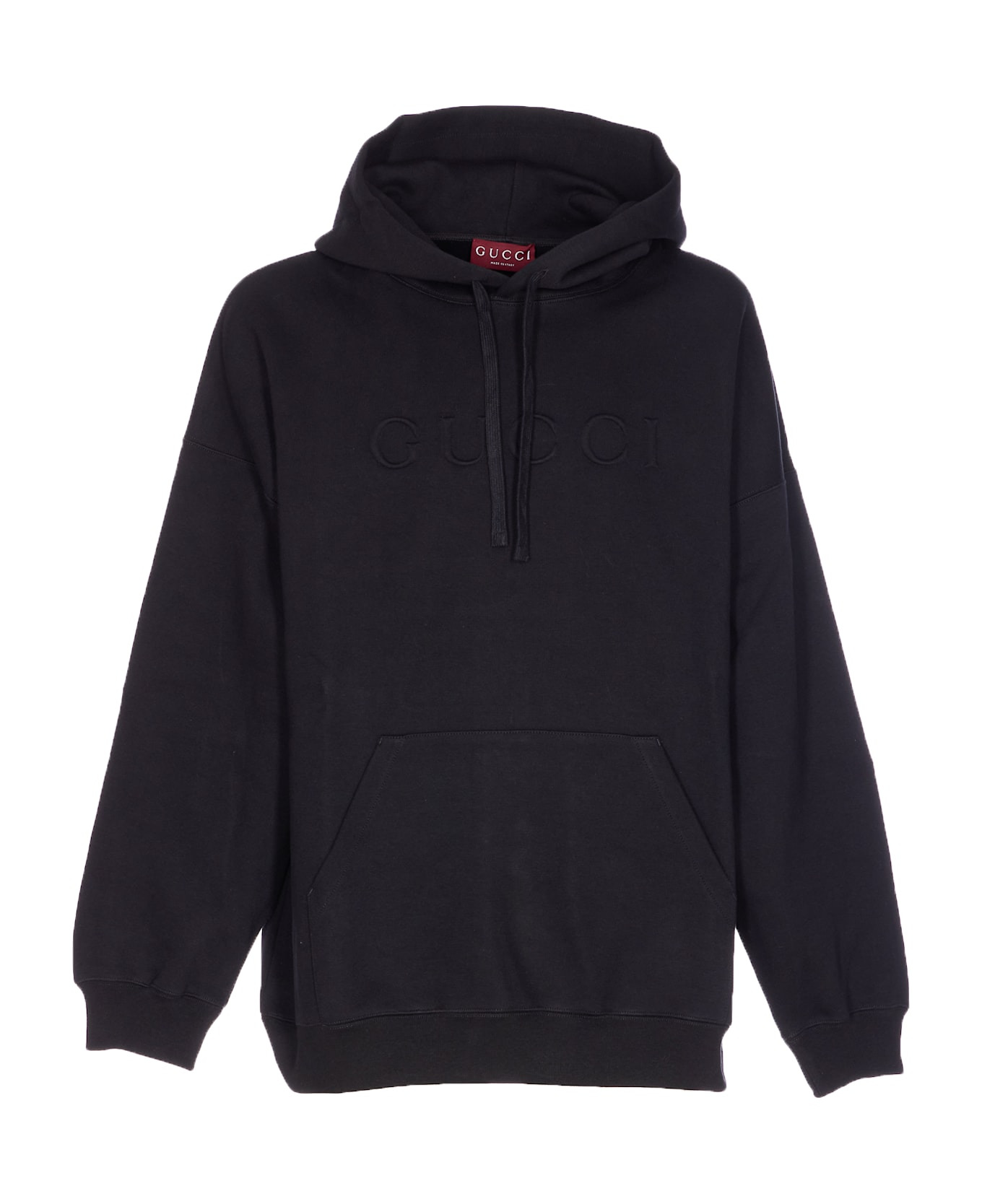 Gucci black hoodie with embossed logo on the front, hood with coulisse, long sleeves, kangaroo pocket Composition: 60% Cotton, 40% Polyamide, 98% %cotton, 2% Elastane Made in: Italy Color: Black Size and fit: - US SIZE Model number: 795470XJG2F1043