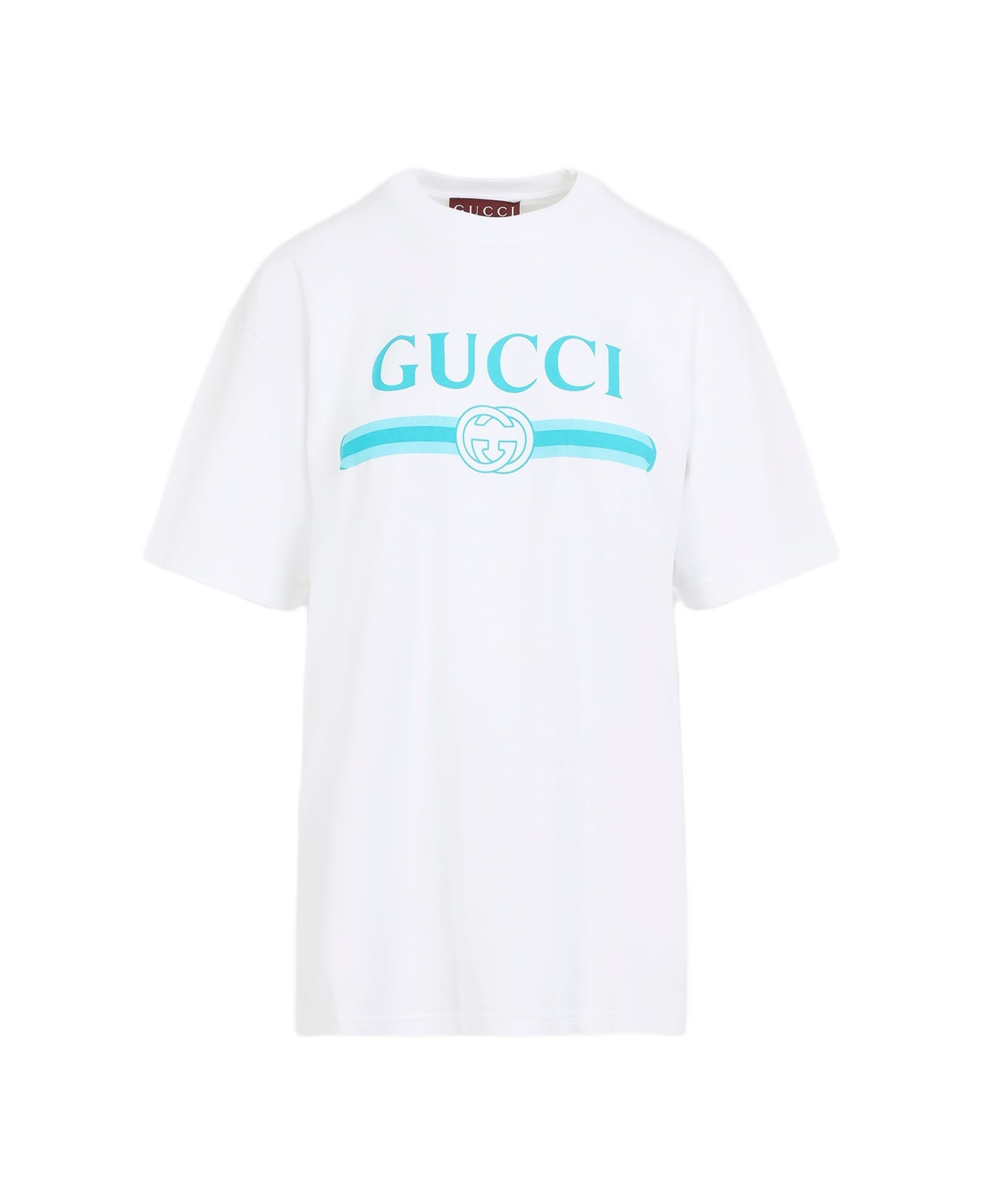 Gucci Logo White Cotton T-shirt. Crafted from white cotton jersey, round ribbed neckline, stamped Gucci Interlocking G and Web on the front, dropped shoulders, short sleeves, straight hem, oversized fit. Made in: Italy Color: White Model number: 837959XJHGY9081