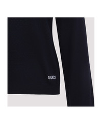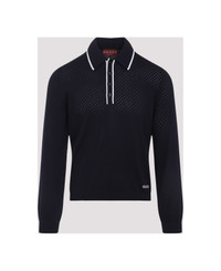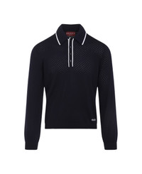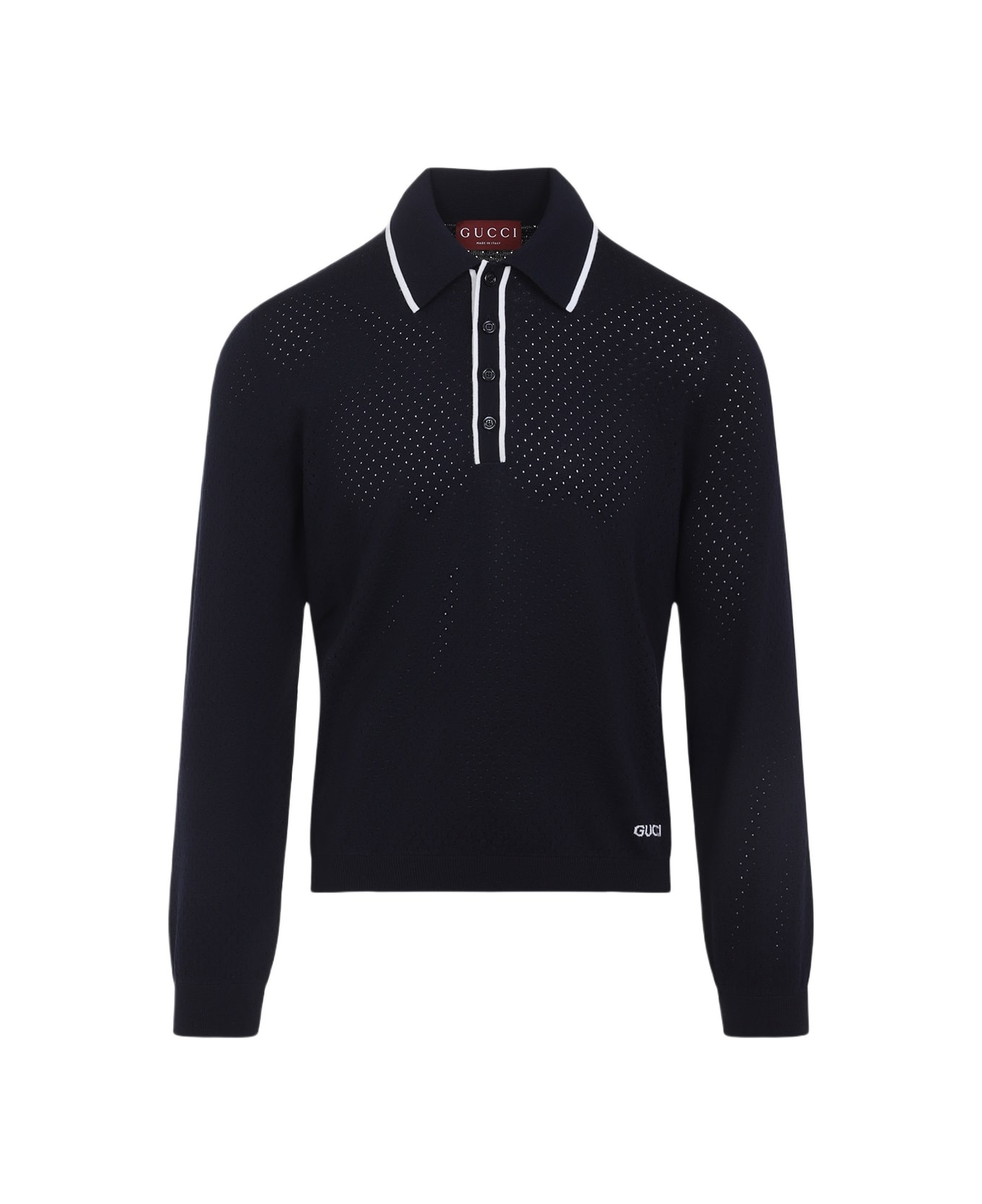 Gucci Long Sleeves Blue Wool Polo. Crafted from dark blue perforated wool, polo collar, front four button fastening, white contrasting details at the collar and placket, logo inlay at the front, long sleeves, ribbed edges. Made in: Italy Color: Ink Ivory Model number: 824573XKESP4423