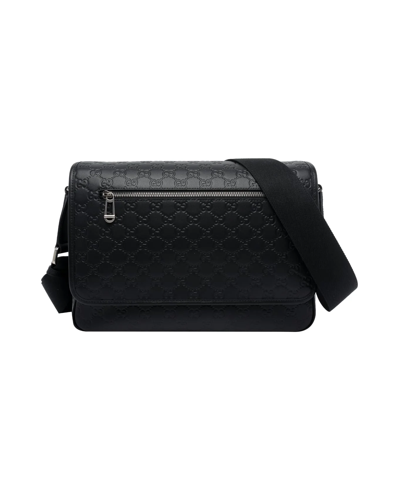 Gucci black Medium GG emblem crossbody bag, magnetic closure, inner zipped pocket, external pocket, adaptable strap, tone on tone logo allover Composition: 100% Calf Leather Made in: Italy Color: Black Size and fit: - 23x34x10 cm Model number: 850235AAFOM1053