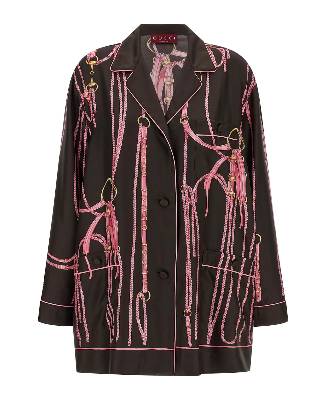 All-over clamp print silk shirt, pajama style with peak lapel neckline, front pockets, front button closure, contrast piping, long sleeves. Composition: 100% silk Made in: Italy Color: Multicolor Size and fit: - Comfort fit Model number: 848553ZAT9Y2083