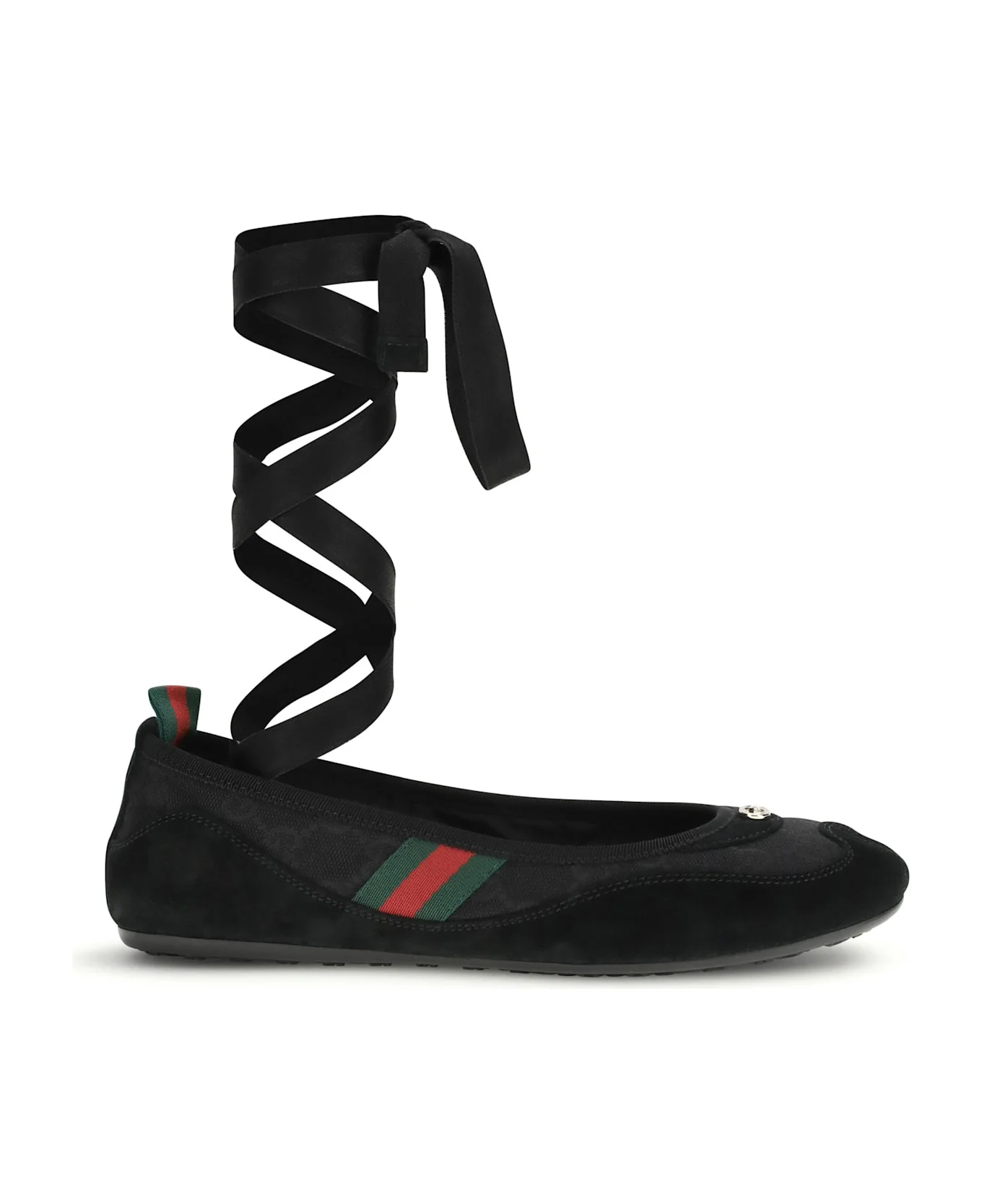 The shift ballerinas by gucci feature elegant black gg fabric with black suede trim. they have a web detail on the side and a ring on the back, which enrich the design. the toe is decorated with a metal gg cross, while the flexible rubber sole is embellished with the gg cross motif. removable satin laces allow you to customize the look, making this flat shoe ideal for any occasion. Composition: 100% % Fabric Made in: Italy Model number: 857964AAF141096