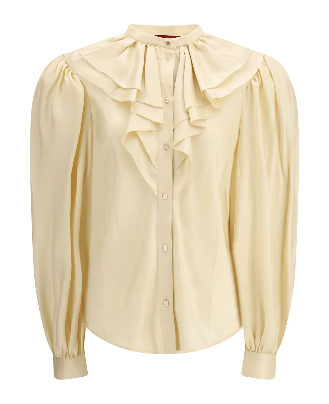 The silk twill shirt by gucci embodies refined elegance with a confident romantic flair. designed in a regular fit, it fits true to size and offers effortless wearability, while the silk twill fabric provides a smooth, fluid feel with a subtle sheen. the silhouette is enhanced by delicate ruffle trim, contrasted with wide shoulders that add structure and modern attitude. long sleeves and a single-row front button closure, finished with the iconic interlock g button detail, complete a sophisticated piece that transitions seamlessly from polished daywear to elevated evening looks. Composition: 100% % Silk Made in: Italy Model number: 854515ZAJQ72304