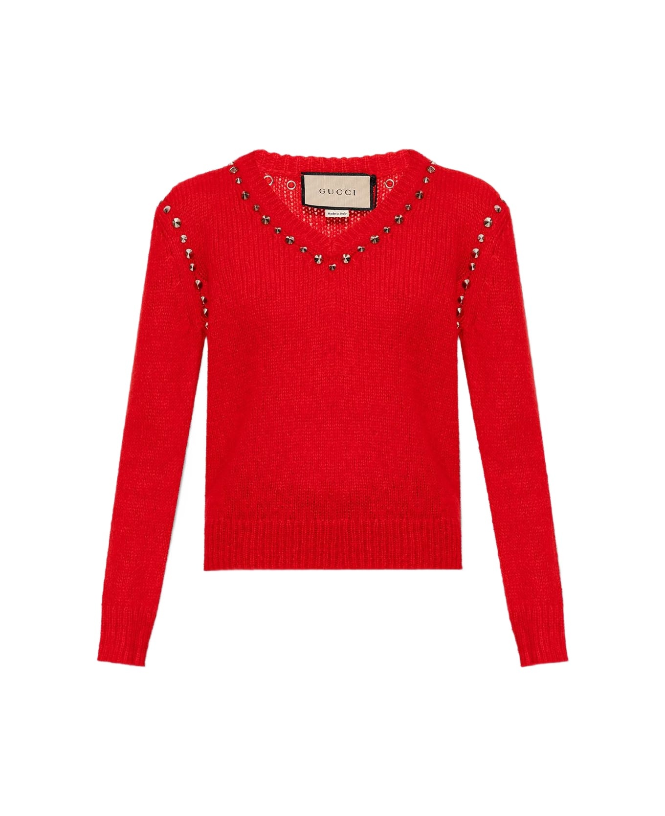 Red V-neck sweater from Gucci. Crafted from a blend of mohair and wool, this style showcases silver-tone stud detailing, long sleeves and ribbed trims on the collar, bottom hem and cuffs. Composition: 66% Mohair 30% Polyamide 4% Wool Made in: Italy Color: MULTICOLOUR Model number: 721152XKCQM6429