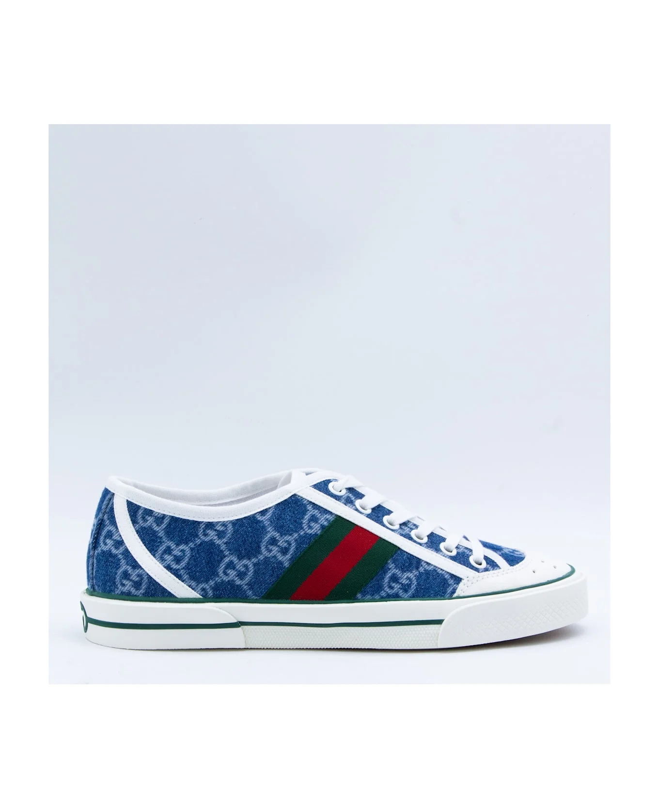 White and blue leather sneakers from Gucci featuring round toe, laces fastening and logo pattern. Composition: _cover, 100% Le Sole, 100% Elastodiene Made in: Italy Color: Denim Model number: 859219FAFIW4749