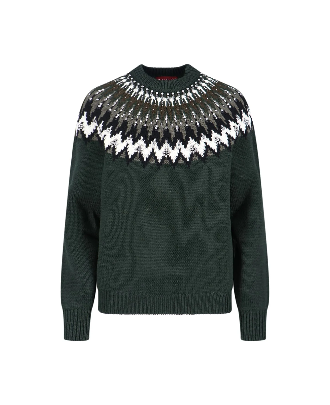 Gucci green wool knitted sweater with crew neck, top knit pattern, long sleeves, Gucci inlaid logo on the side, ribbed trim, straight hem. Composition: 100% Wool Made in: Italy Color: Green Size and fit: - Vestibilita regolare Model number: 796251XKD733754