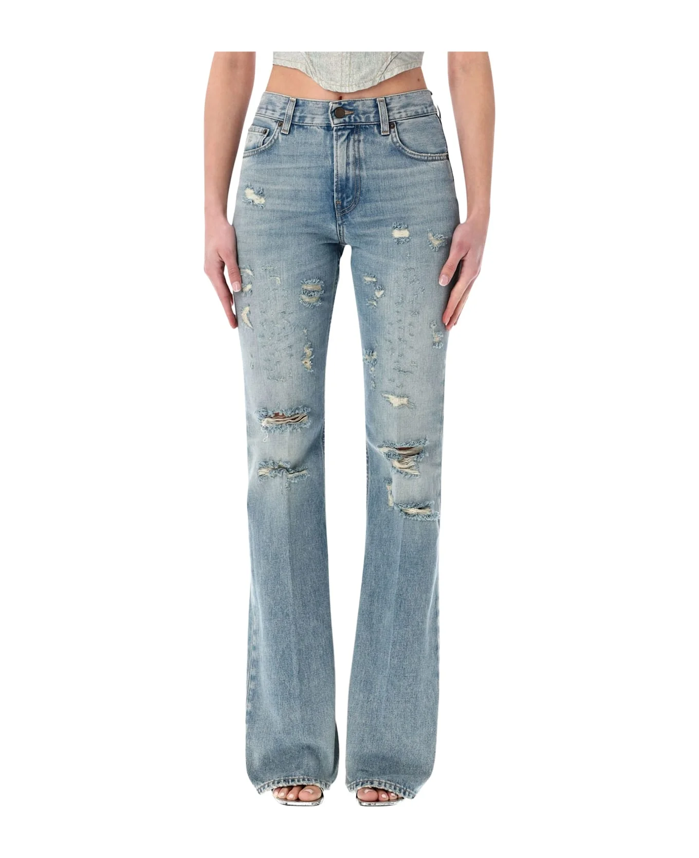 The Haikure Flora Broken Jeans Are Crafted From Premium Cotton For Comfort And Durability. Featuring A Button And Zip Fly, Five-pocket Styling, And Subtle Distressed Details Throughout, These Straight-leg Jeans Offer A Modern, Edgy Look. Perfect For Casual Urban Outfits, They Combine Functionality With Contemporary Design Button And Zip Fly Closure Five-pocket Design Distressed, broken Detailing Straight-leg Fit, Mid-rise Waist Alessandra Is 1,75 M And Wears Size 26 Composition: 80% organic cotton, 20% recycled cotton Made in: Italy Color: BROKEN CELESTIAL Model number: HEW03338DF203L0931