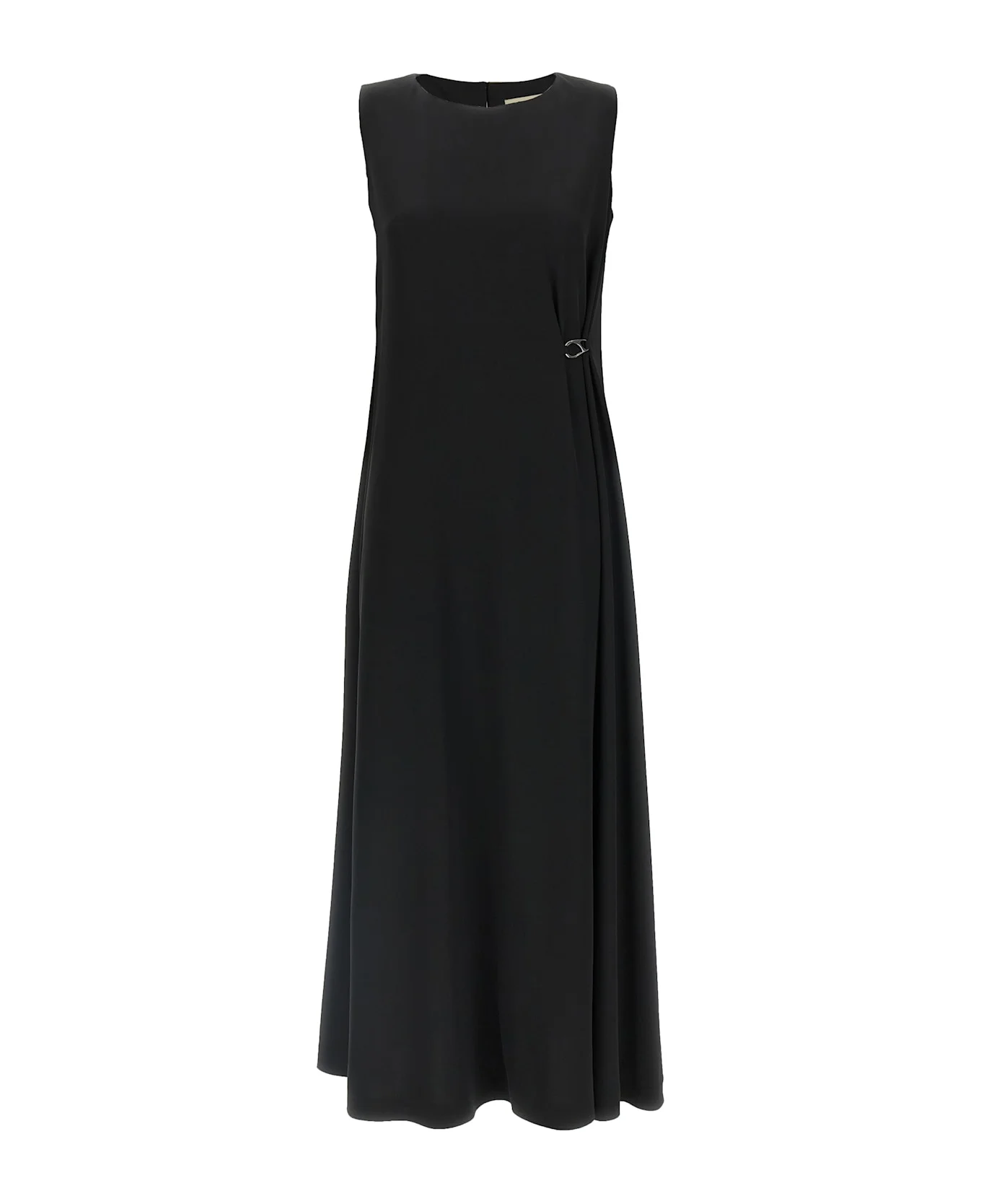 Long fluid fabric dress with diagonal armor, front metal hook detail to create side drapes, flared silhouette, round neckline with button closure and back teardrop cut-out detail. Composition: 96% polyester, 4% elastane Made in: Italy Color: Black Size and fit: - Comfort fit Model number: AB000069D128859300